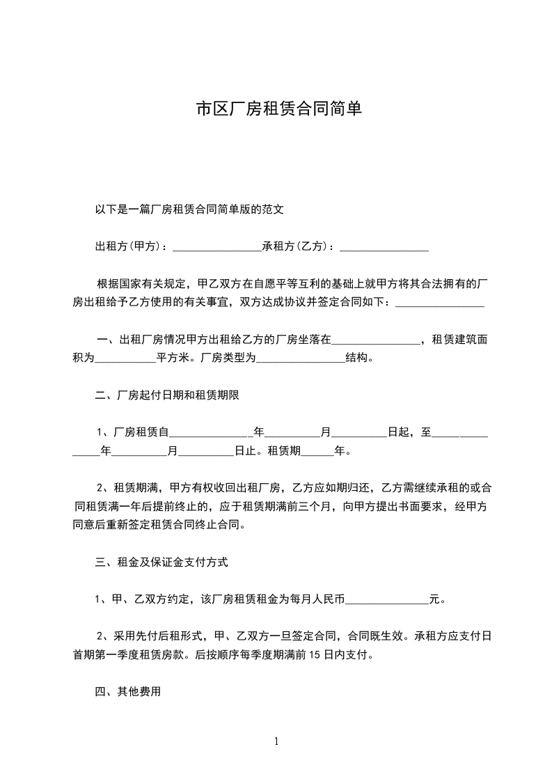 以下是一篇厂房租赁合同简单版的范文