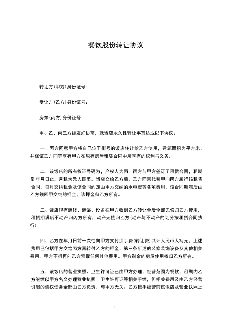 一、丙方同意甲方将自己位于街号的饭店转让给乙方使用,建筑面积为_____平方米;并保证乙方同等享有甲方在原有房屋租赁合同中所享有的权利与义务。