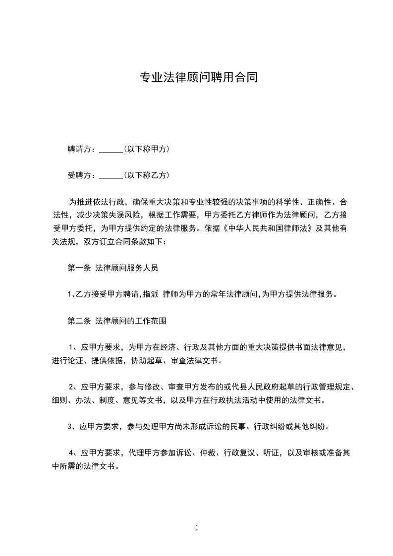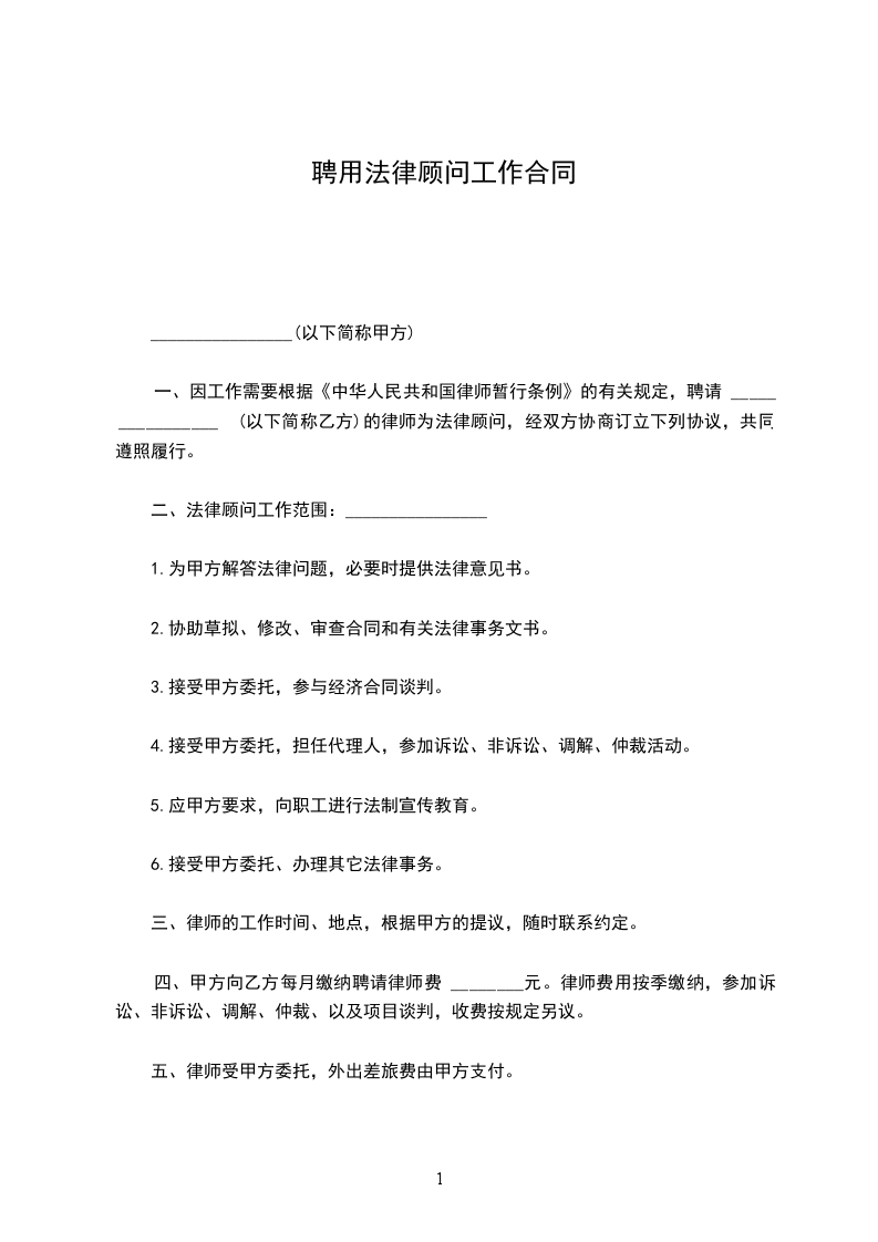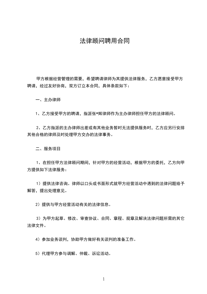 1、乙方接受甲方的聘请,指派张*辉律师作为主办律师担任甲方的法律顾问。