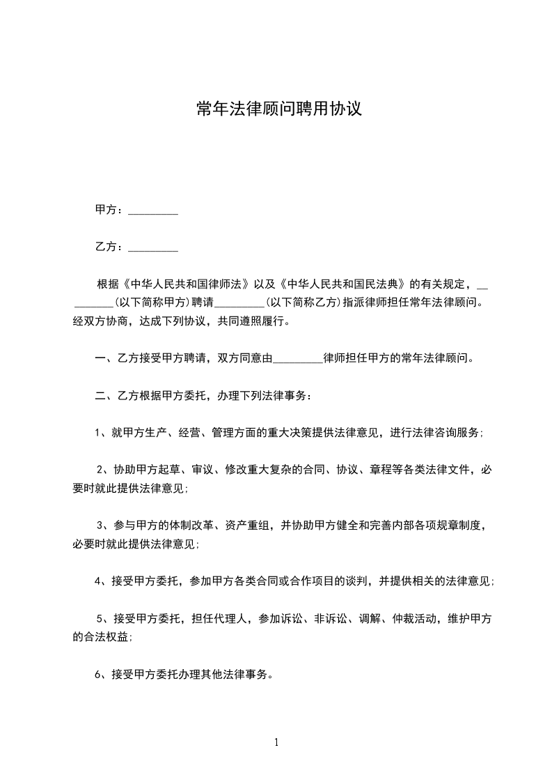 1、甲方每年向乙方支付基本法律顾问酬金人民币**万元(¥)