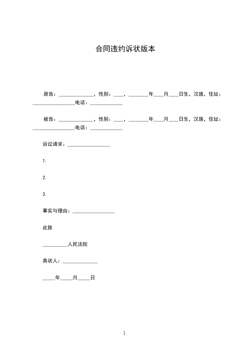 原告:______________,性别:____,________年____月____日生,汉族,住址:_________________电话:_____________