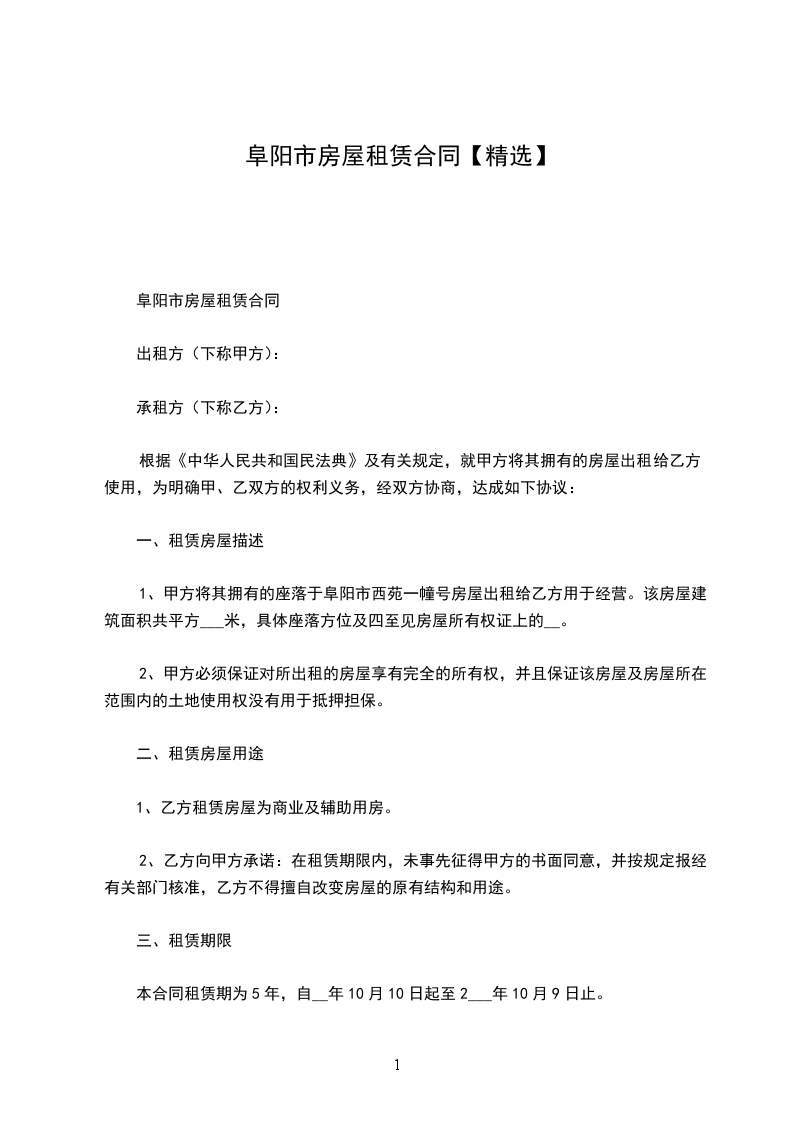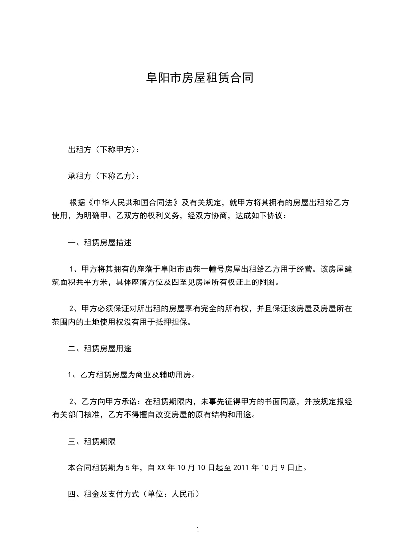 1、甲方将其拥有的座落于阜阳市西苑一幢号房屋出租给乙方用于经营。该房屋建筑面积共平方米,具体座落方位及四至见房屋所有权证上的附图。