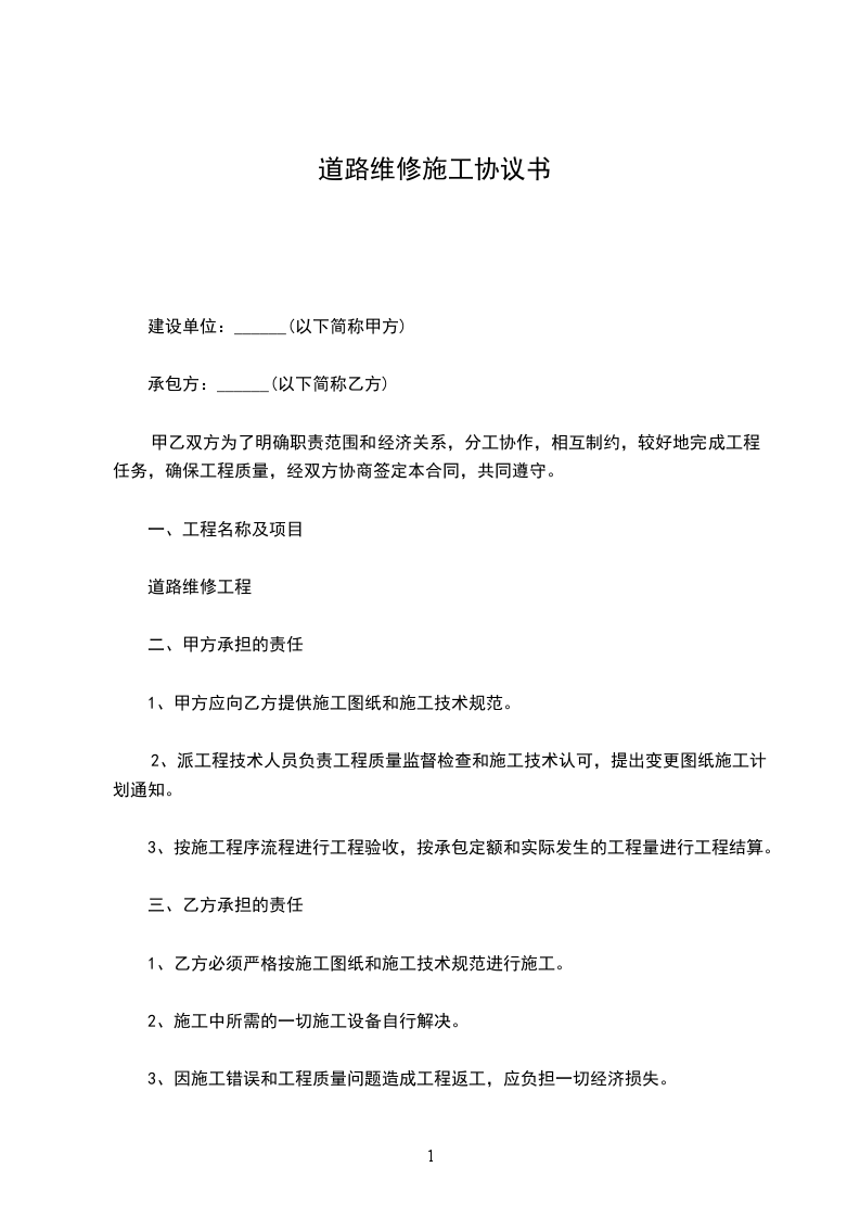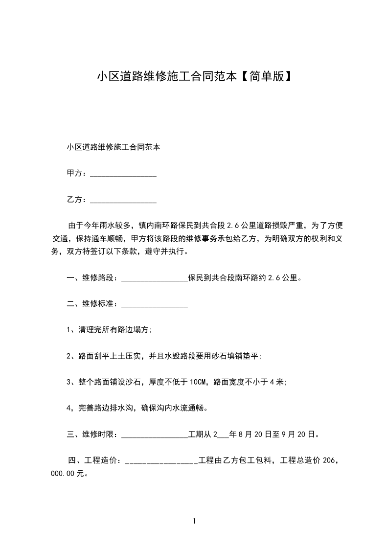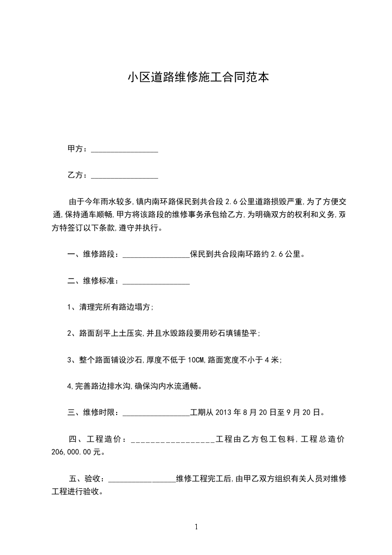 由于今年雨水较多,镇内南环路保民到共合段2.6公里道路损毁严重,为了方便交通,保持通车顺畅,甲方将该路段的维修事务承包给乙方,为明确双方的权利和义务,双方特签订以下条款,遵守并执行。
