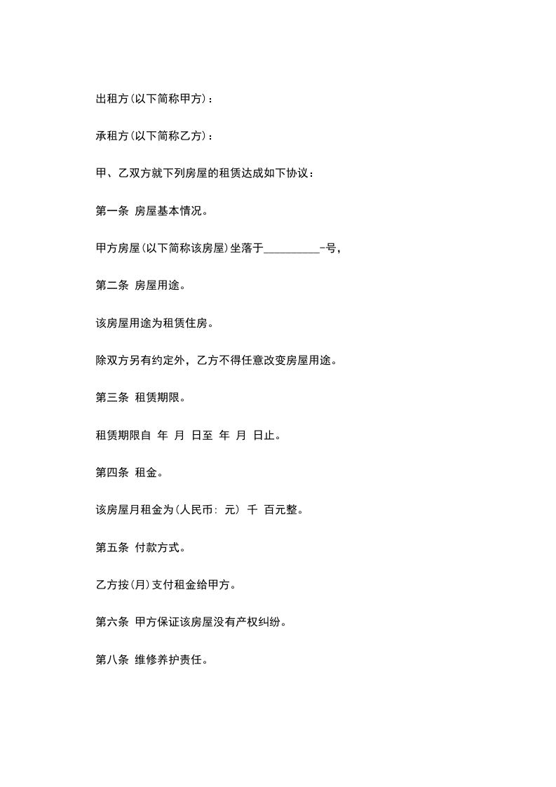 第六条.甲方向乙方收取个月租金数额的租赁房屋保证金,即人民币_____元整,大写人民币_____元