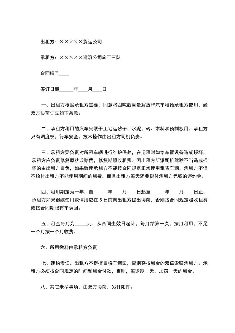 一、出租方根据承租方需要,同意将四吨载重量解放牌汽车租给承租方使用,经双方协商订立如下条款。