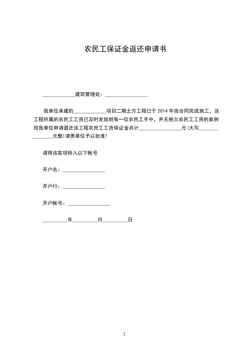 我单位承建的_____________项目二期土方工程已于2024年按合同完成施工,该工程所属的农民工工资已及时发放到每一位农民工手中,并无拖欠农民工工资的案例。现我单位申请退还该工程农民工工资保证金共计_________________元(大写________________元整)请贵单位予以批准!