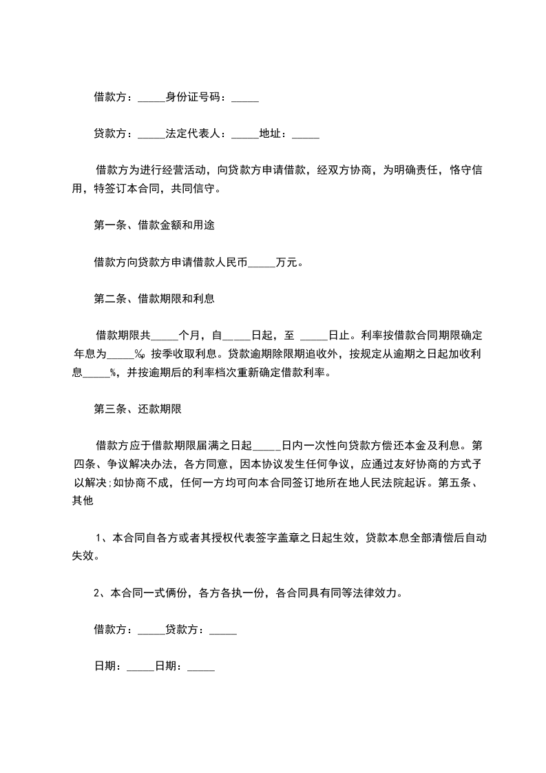 借款期限共()个月,自年()月()日起,至()年()月()日止。利率按借款合同期限确定年息为()‰,按季收取利息。贷款逾期除限期追收外,按规定从逾期之日起加收利息()%,并按逾期后的利率档次重新确定借款利率。