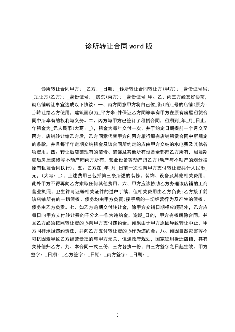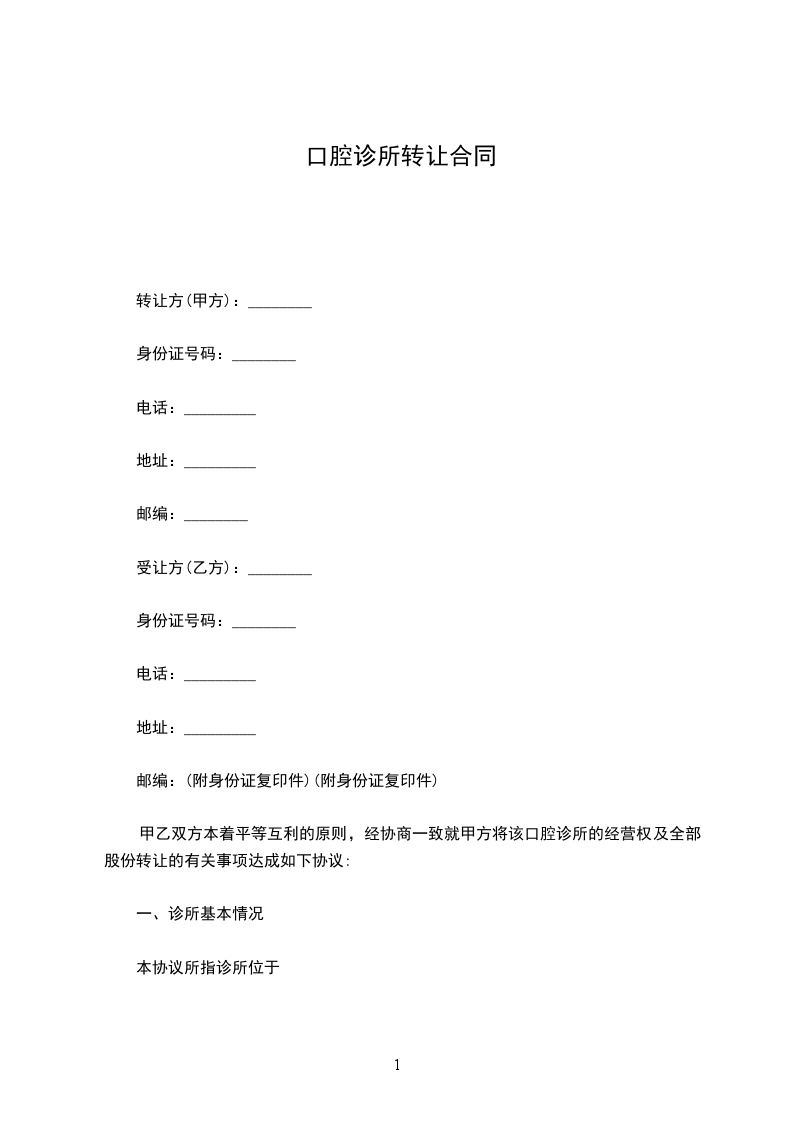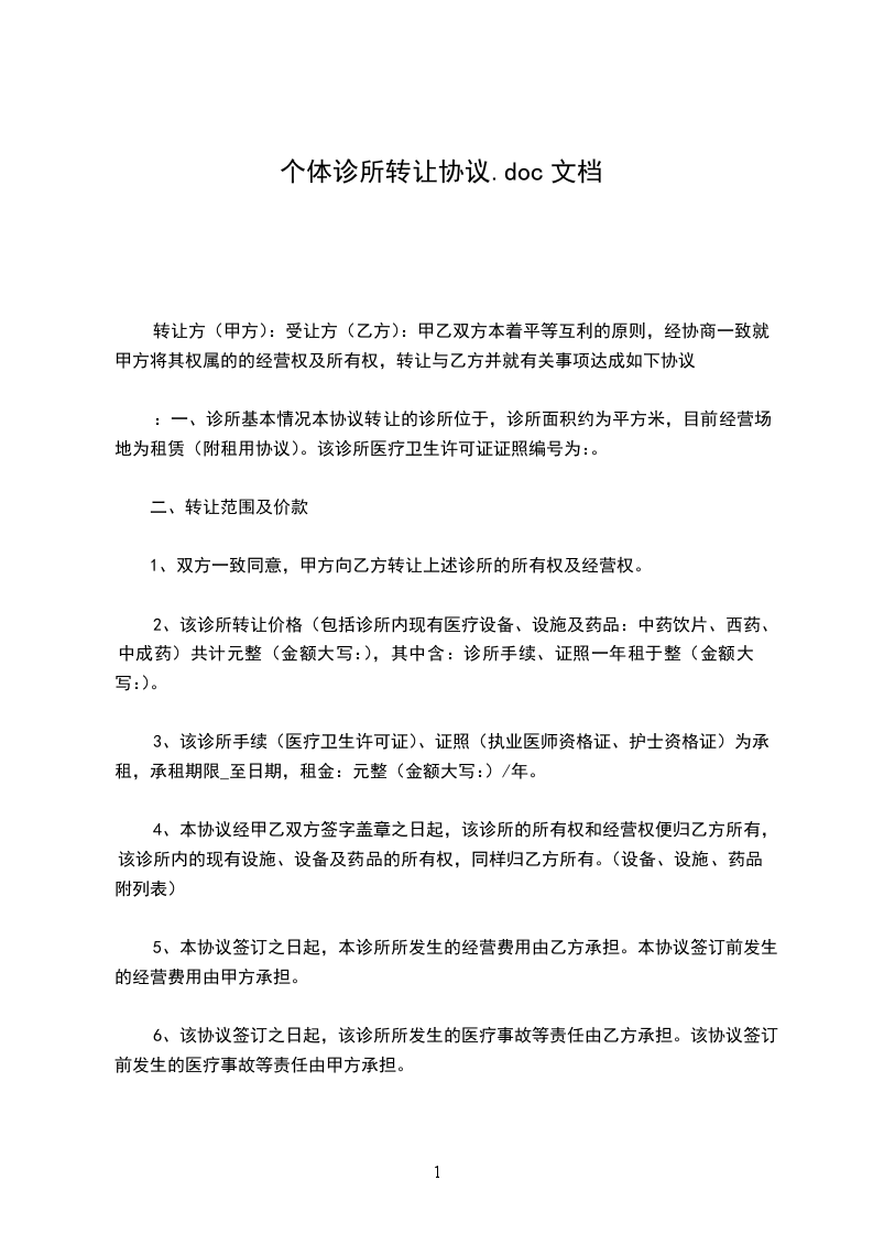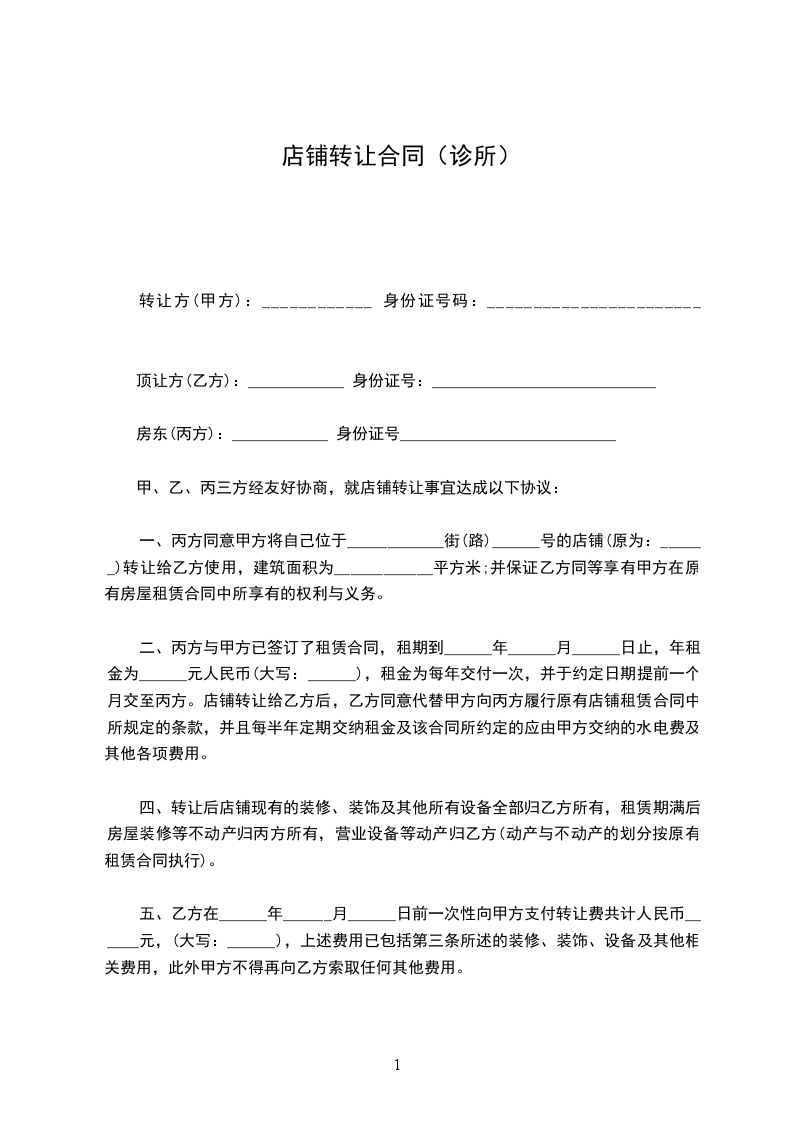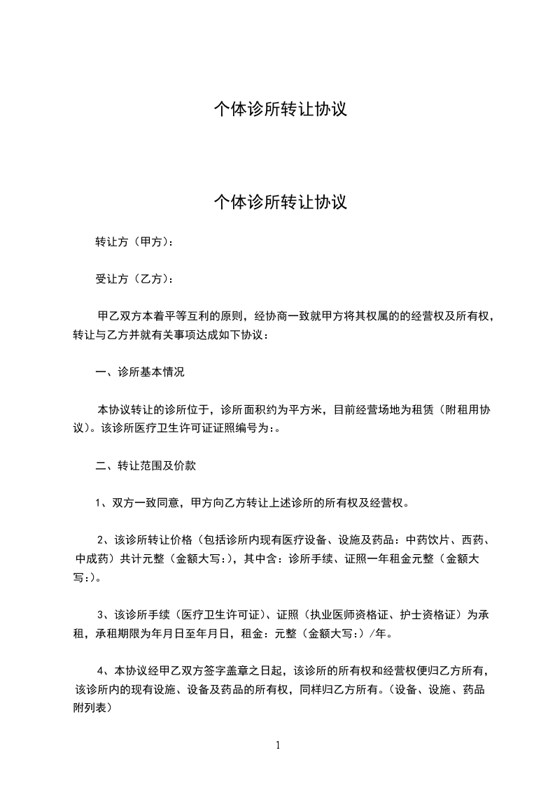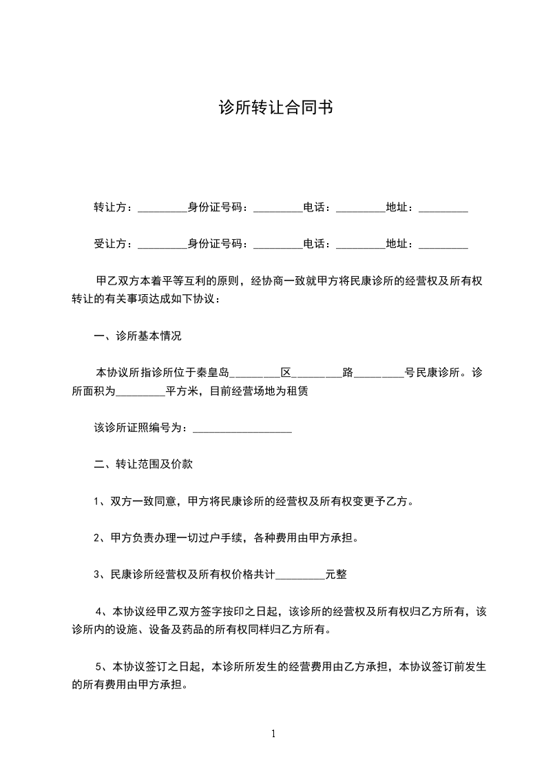1、双方一致同意,甲方向乙方转让上述诊所的所有权及经营权。