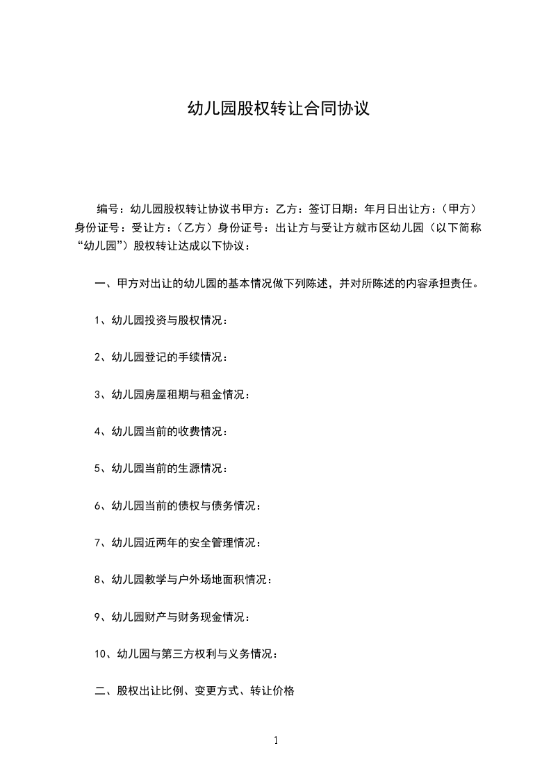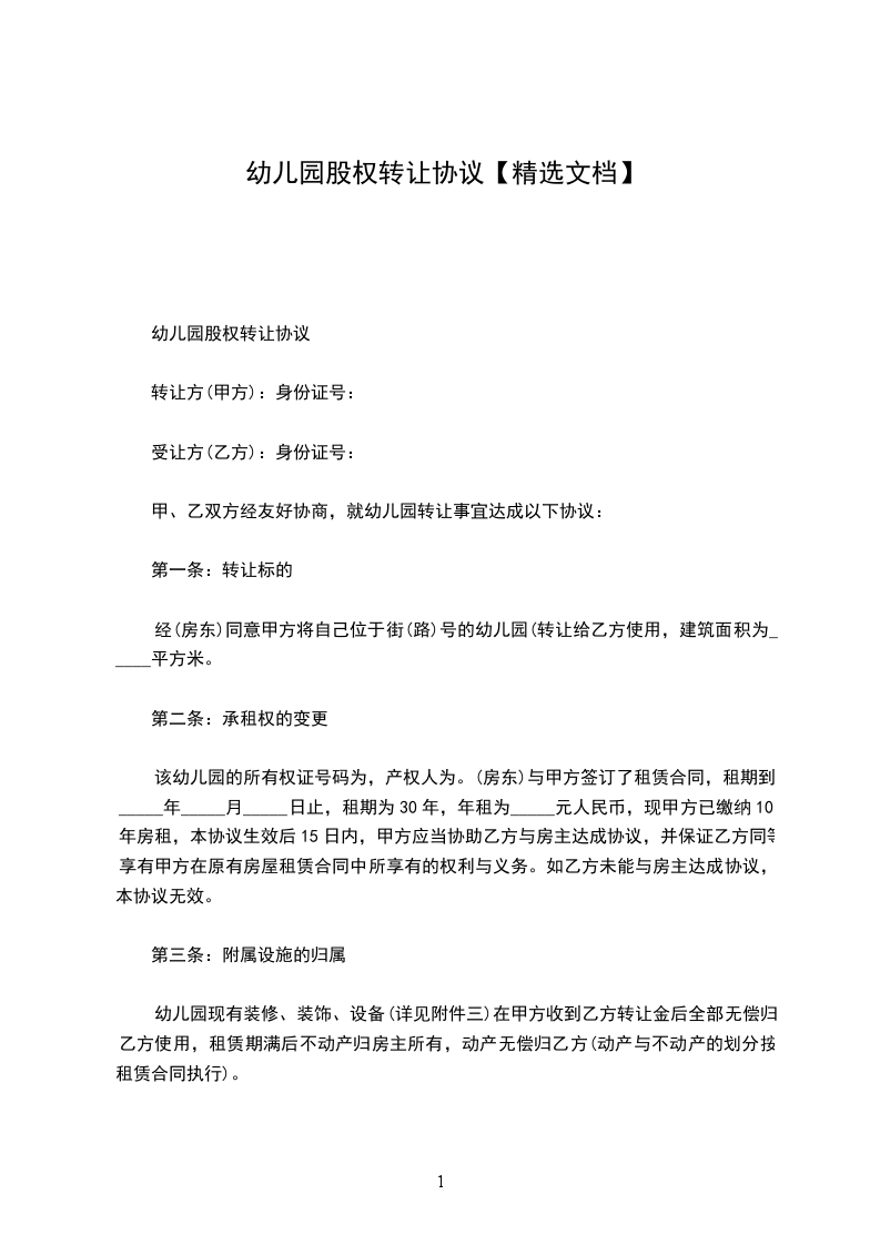 甲、乙双方经友好协商,就幼儿园转让事宜达成以下协议: