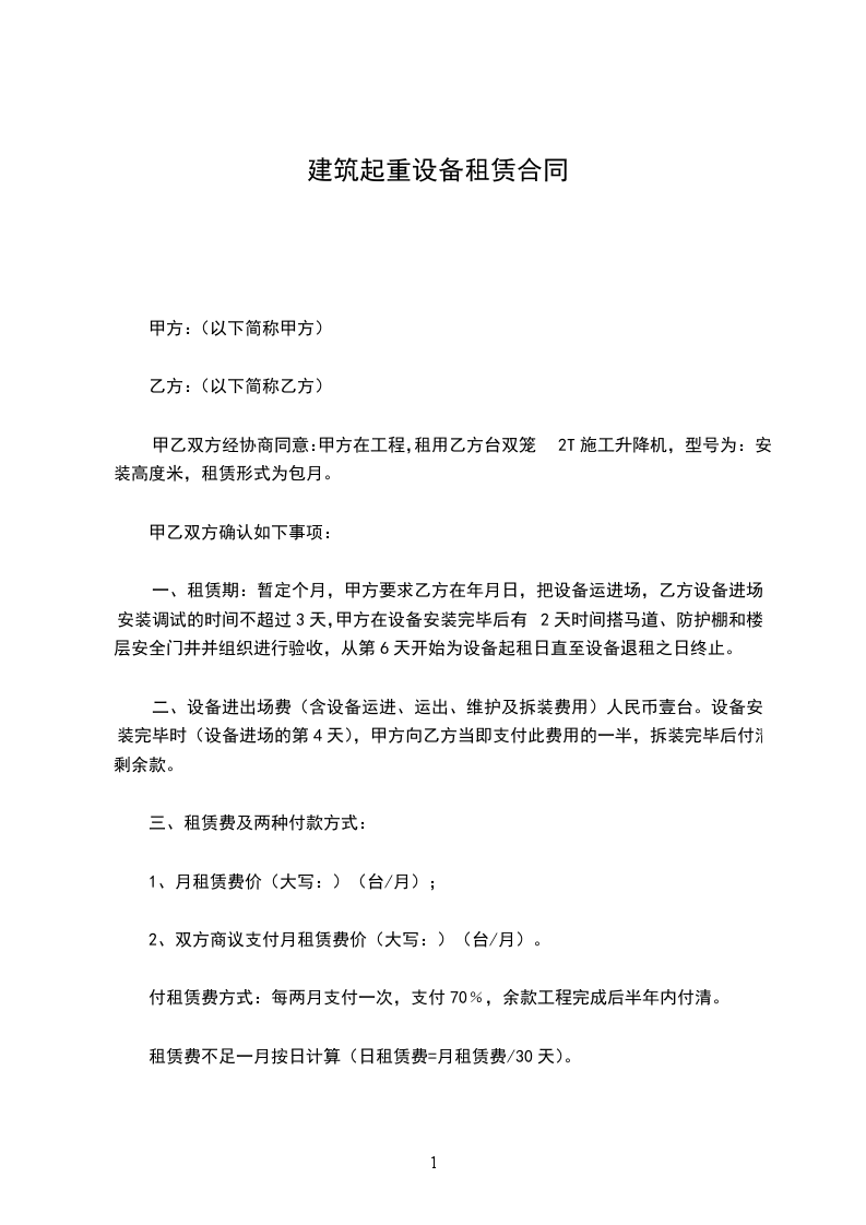 一、租赁期:暂定个月,甲方要求乙方在_____年_____月_____日,把设备运进场,乙方设备进场安装调试的时间不超过3天,甲方在设备安装完毕后有2天时间搭马道、防护棚和楼层安全门井并组织进行验收,从第6天开始为设备起租日直至设备退租之日终止。