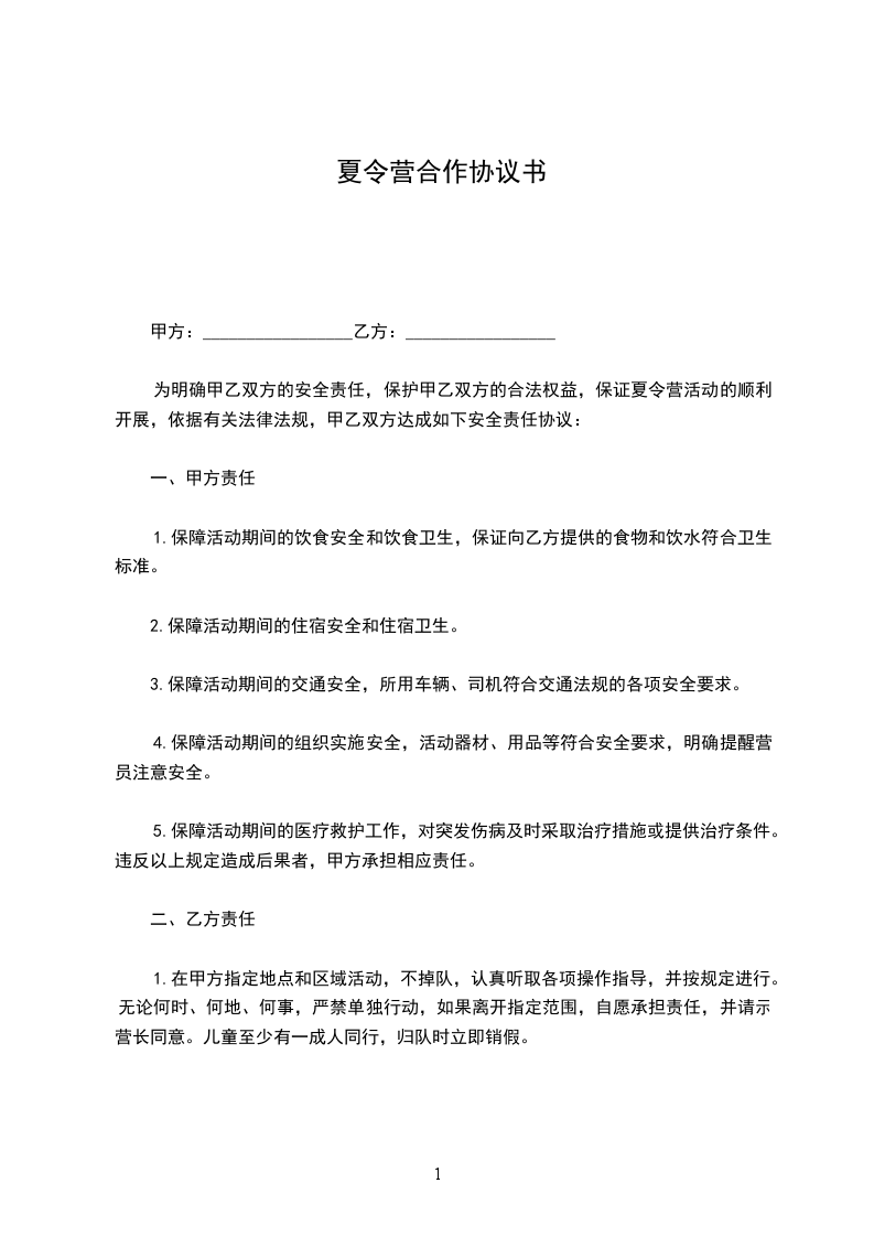 为明确甲乙双方的安全责任,保护甲乙双方的合法权益,保证夏令营活动的顺利开展,依据有关法律法规,甲乙双方达成如下安全责任协议:
