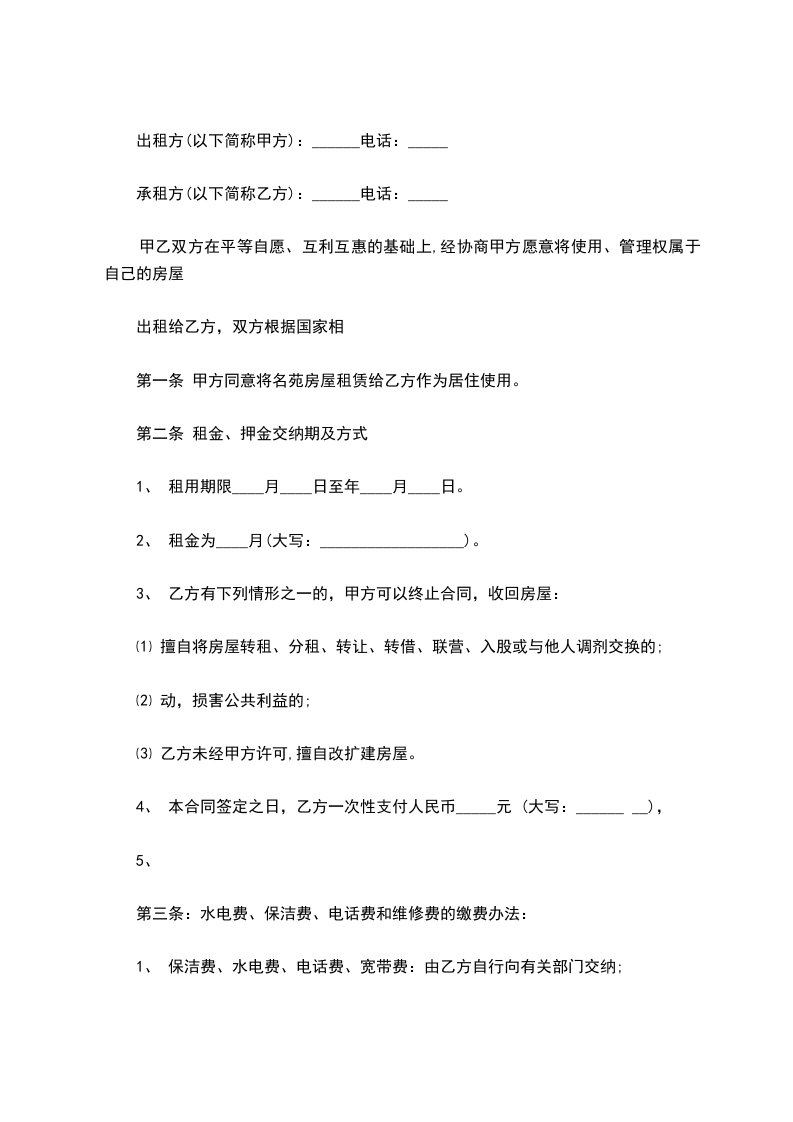 三、乙方租赁期间,水费、电费、取暖费、燃气费、电话费、物业费以及其它由乙方居住而产生的费用由乙方负担。租赁结束时,乙方须交清欠费。