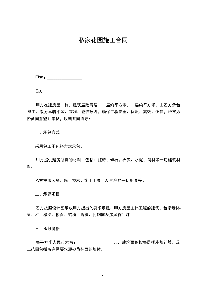 甲方在建房屋一栋,建筑层数两层,一层约平方米,二层约平方米,由乙方承包施工。双方本着平等、互利、诚信原则,确保工程安全、优质、高效、低耗,经双方协商同意签订本俩,以期共同遵守: