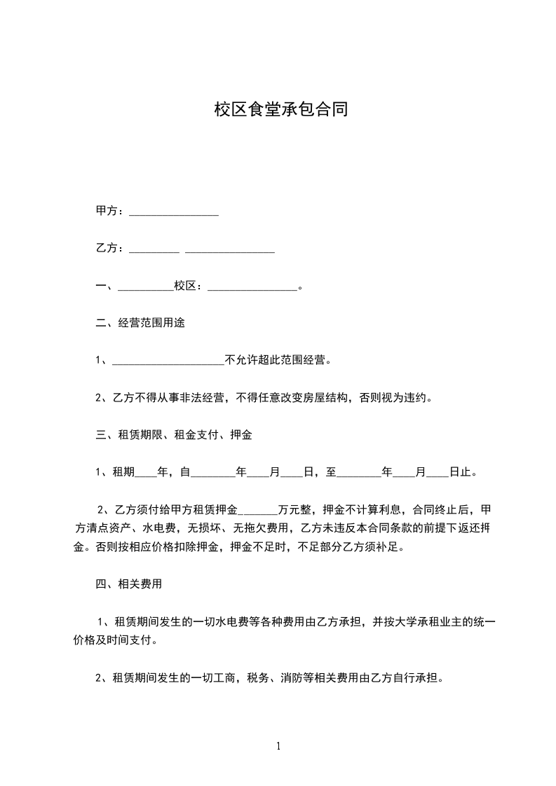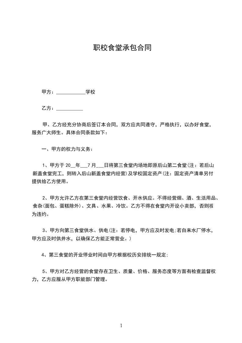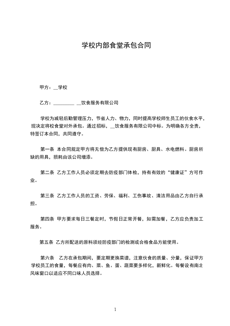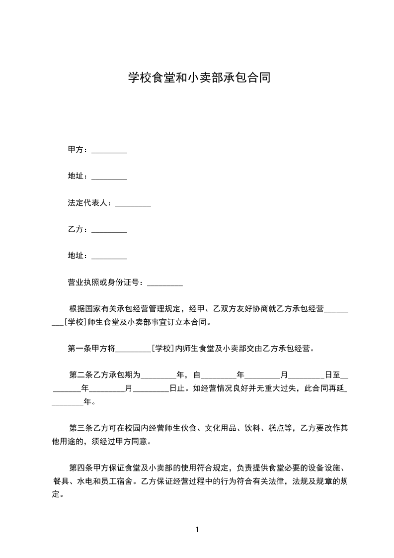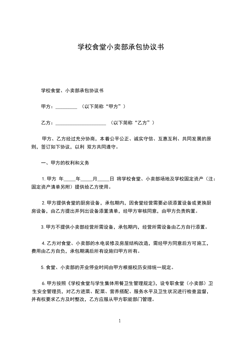 第一条甲方将_________[学校]内师生食堂及小卖部交由乙方承包经营。