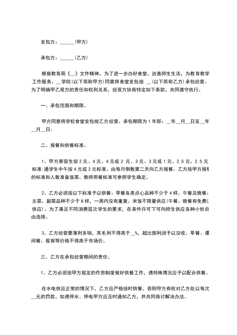第五条乙方承包食堂和小卖部不向甲方交纳租金,但需要在每周的星期一至星期五期间向_________[学校]的教职员工提供价值为_________元的早餐和中餐。(其中早餐_________元,中餐_________元)甲方另向乙方每月交纳餐费共_________元整。每月结算一次,甲方如果在其他时间需乙方供餐时。乙方必须积极配合提供。所需费用按上述早餐和中餐的标准由甲方另行支付。