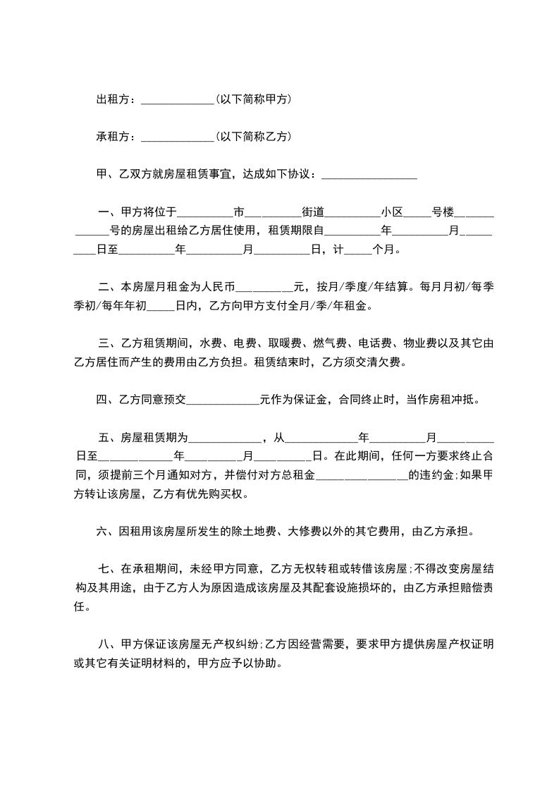 一、甲方将位于__________市__________街道__________小区_____号楼_____________号的房屋出租给乙方居住使用,租赁期限自__________年__________月__________日至__________年__________月__________日,计_____个月。