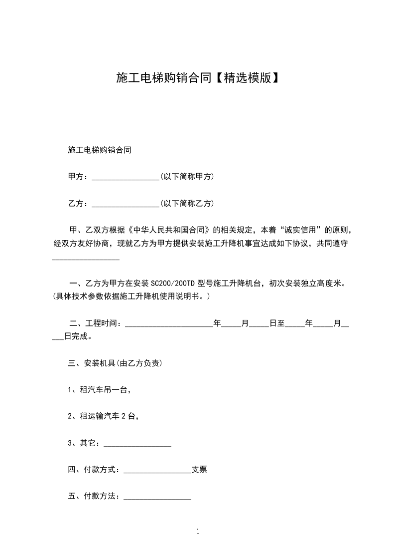 一、乙方为甲方在安装SC200/200TD型号施工升降机台,初次安装独立高度米。(具体技术参数依据施工升降机使用说明书。)