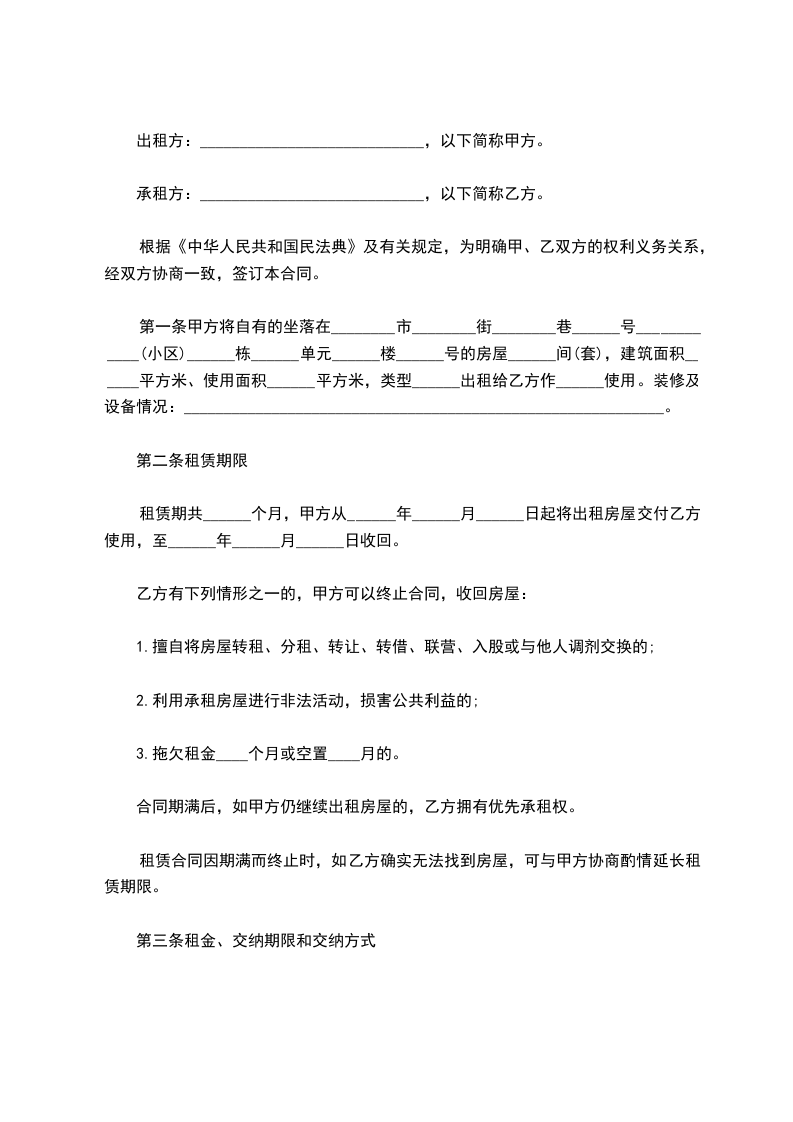 第一条甲方将自有的坐落在________市________街________巷______号____________(小区)______栋______单元______楼______号的房屋______间(套),建筑面积______平方米、使用面积______平方米,类型______出租给乙方作______使用。装修及设备情况:____________________________________________________________。