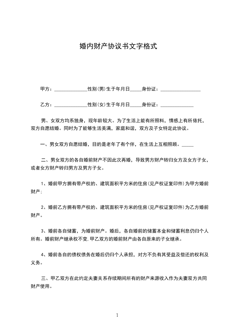 男、女双方均系独身,现年龄较大。为了生活上能有所照料,情感上有所依托,双方自愿结婚。同时为了能够生活美满,家庭和谐,双方及子女特定此协议。