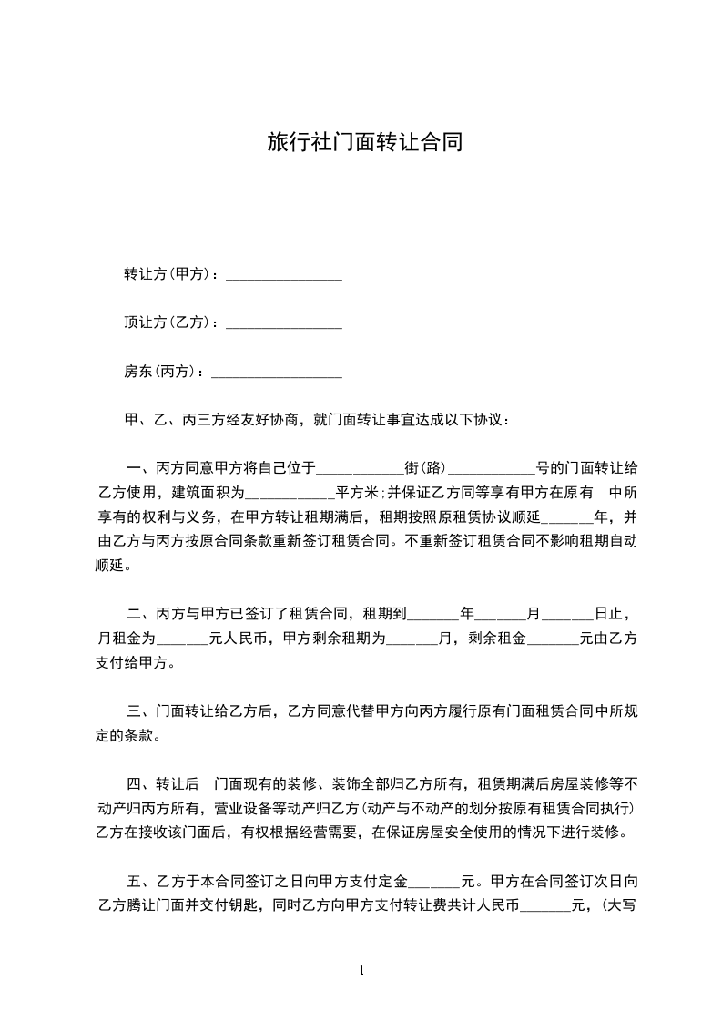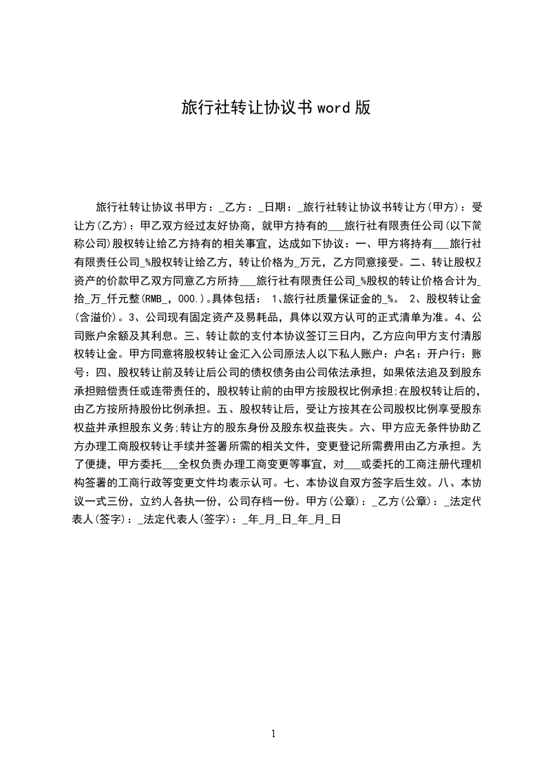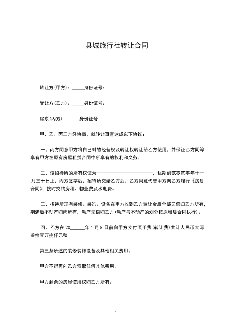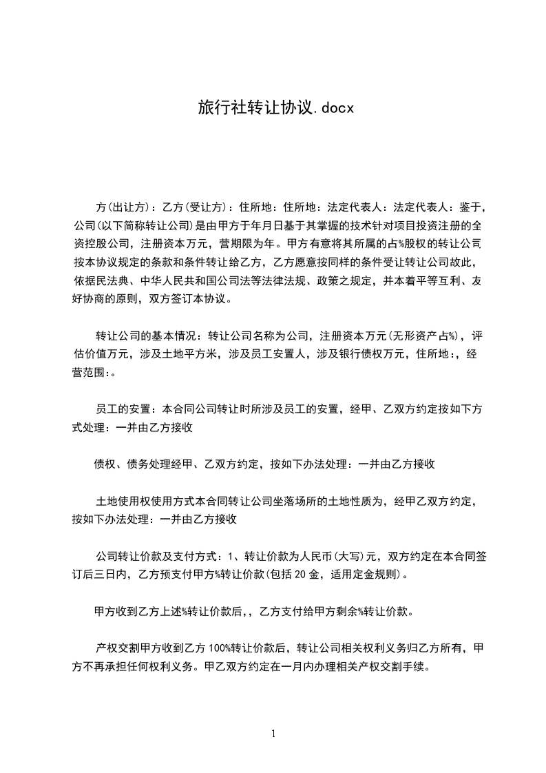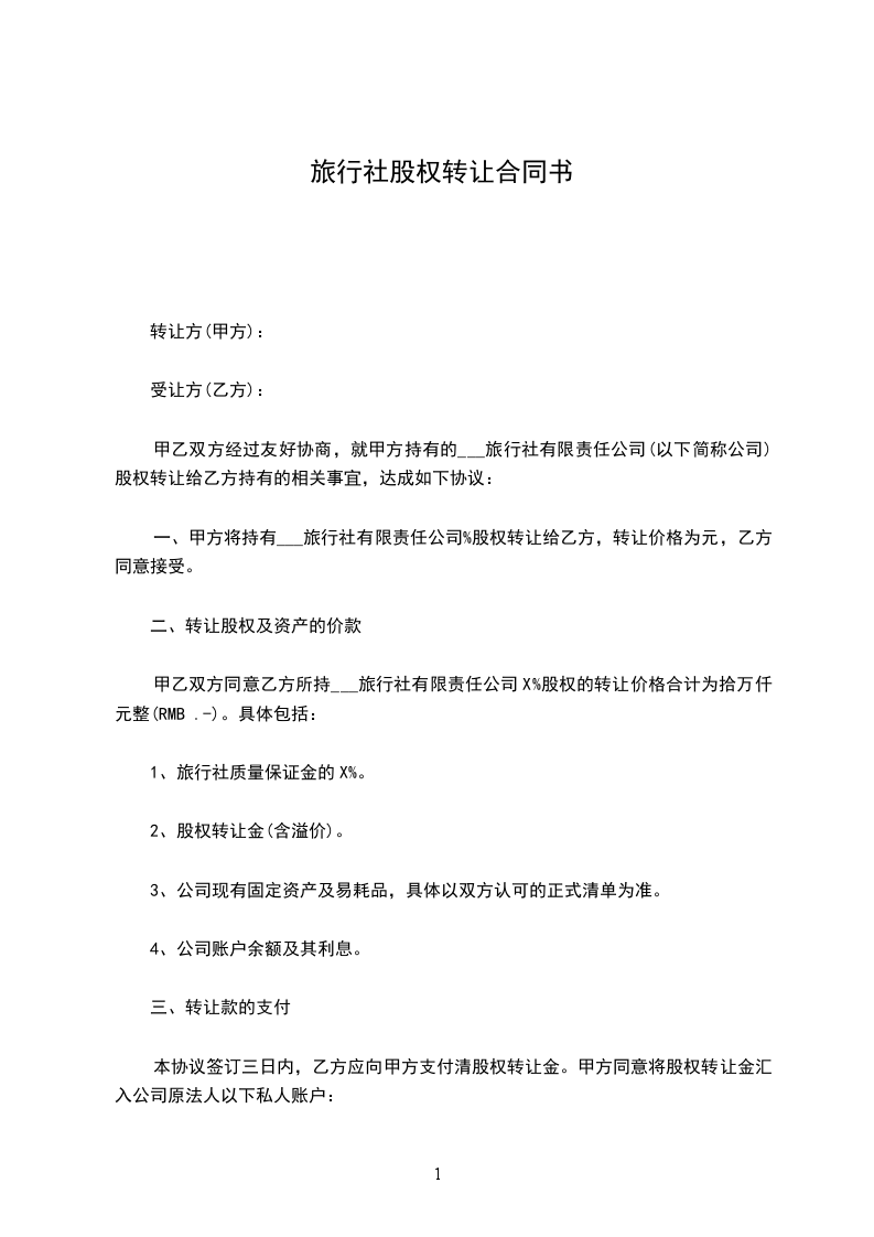 1、转让价款为人民币(大写)元,双方约定在本合同签订后三日内,乙方预支付甲方%转让价款(包括20%定金,适用定金规则)。