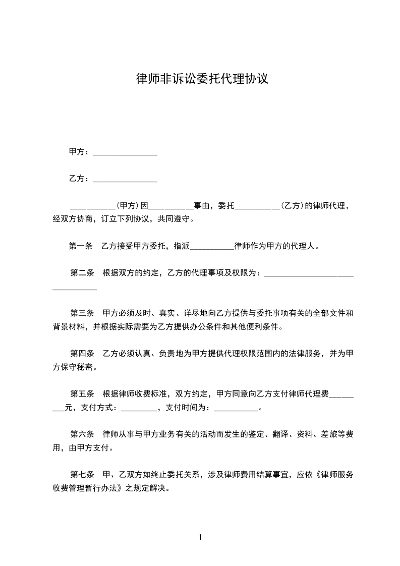 _____________(甲方)因_____________事由,委托_____________(乙方)的律师代理,经双方协商,订立下列协议,共同遵守。