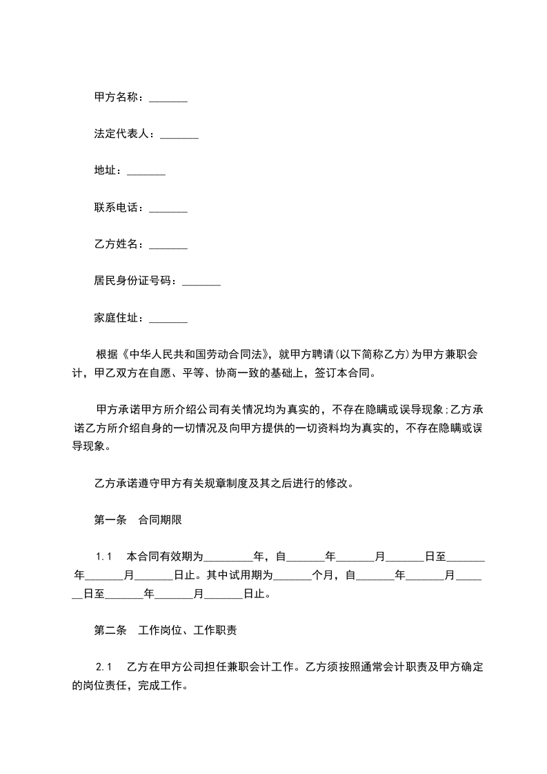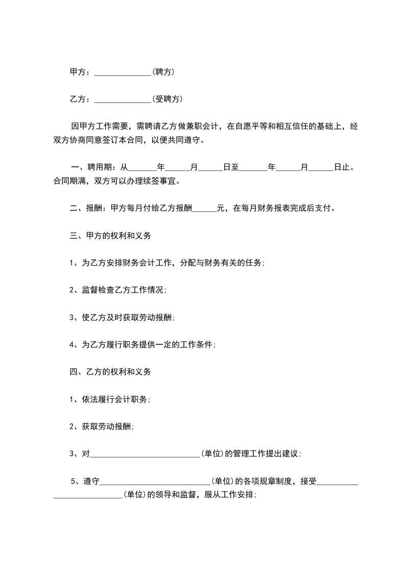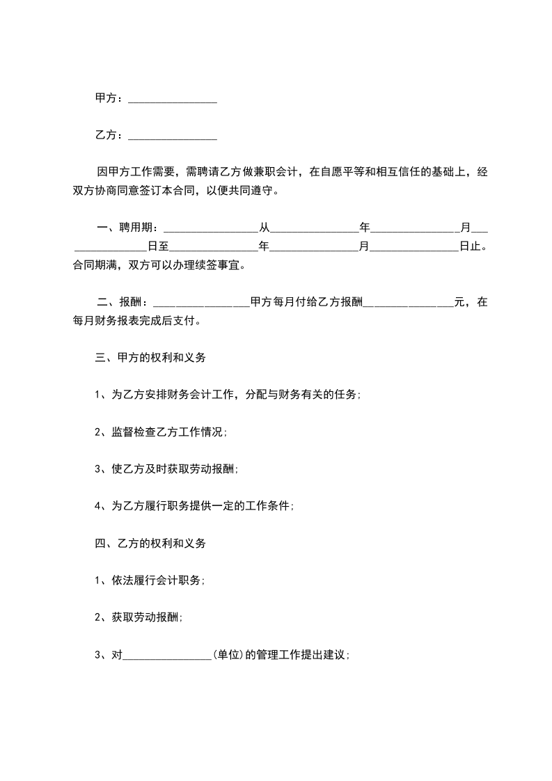 因甲方工作需要,需聘请乙方做兼职会计,在自愿平等和相互信任的基础上,经双方协商同意签订本合同,以便共同遵守。