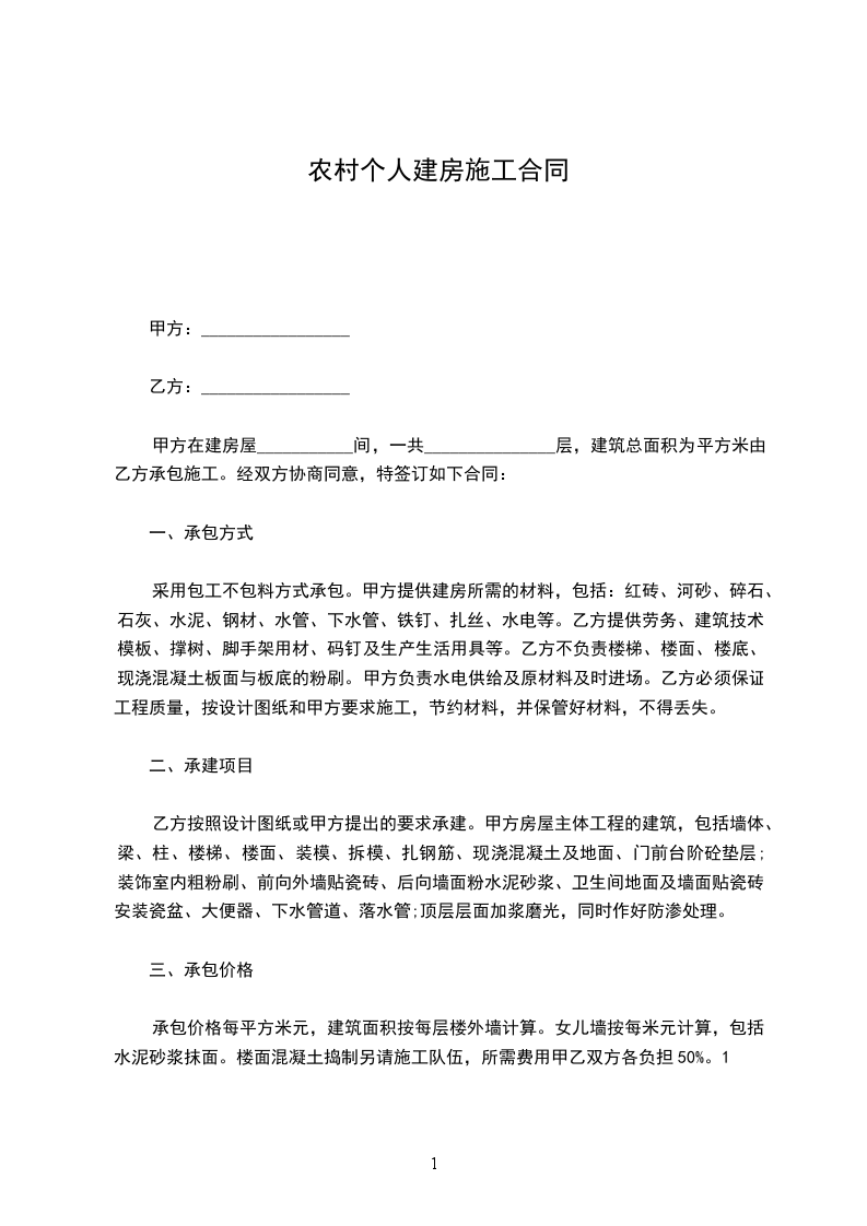采用包工不包料方式承包。甲方提供建房所需的材料,包括:红砖、河砂、碎石、石灰、水泥、钢材、水管、下水管、铁钉、扎丝、水电等。乙方提供劳务、建筑技术、模板、撑树、脚手架用材、码钉及生产生活用具等。乙方不负责楼梯、楼面、楼底、现浇混凝土板面与板底的粉刷。甲方负责水电供给及原材料及时进场。乙方必须保证工程质量,按设计图纸和甲方要求施工,节约材料,并保管好材料,不得丢失。