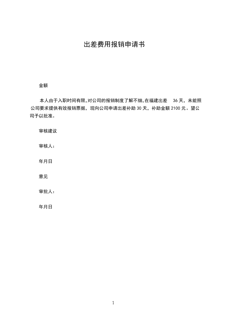 本人由于入职时间有限,对公司的报销制度了解不细,在福建出差36天,未能照公司要求提供有效报销票据,现向公司申请出差补助30天,补助金额2100元。望公司予以批准。