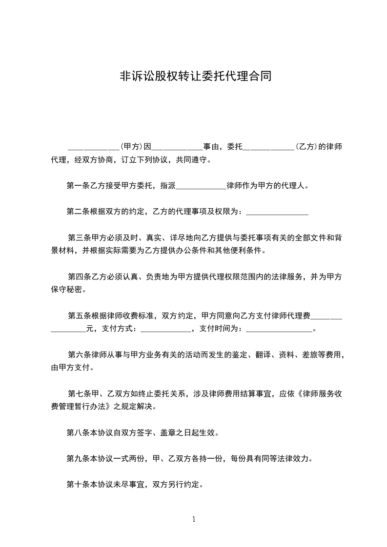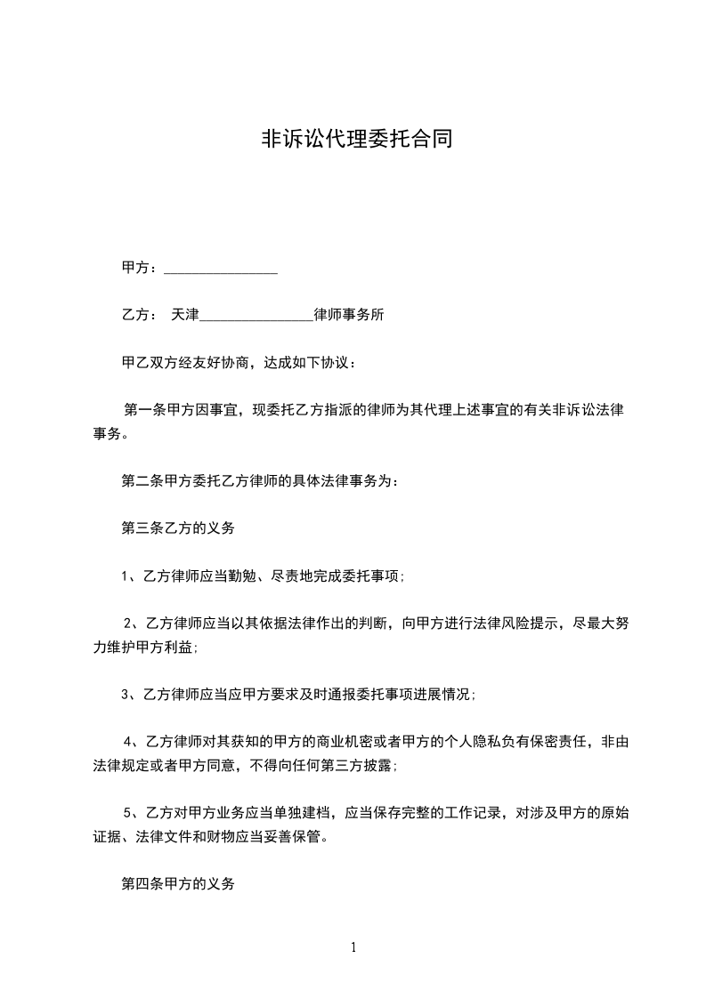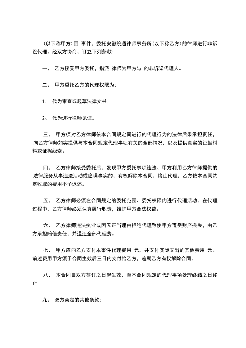 _____________(甲方)因_____________事由,委托_____________(乙方)的律师代理,经双方协商,订立下列协议,共同遵守。