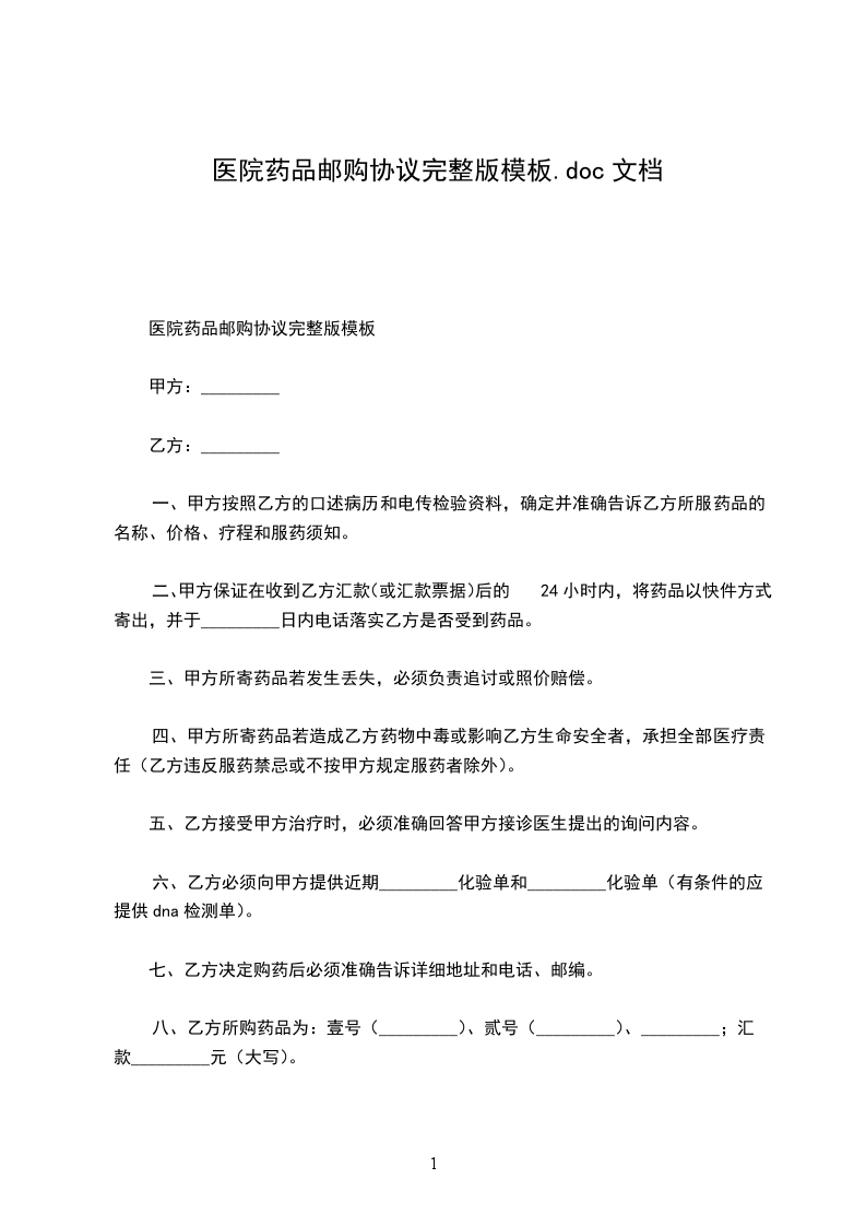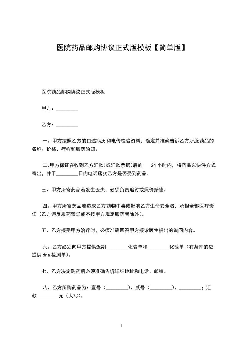 八、乙方所购药品为:壹号(_________)、贰号(_________)、_________;汇款_________元(大写)。