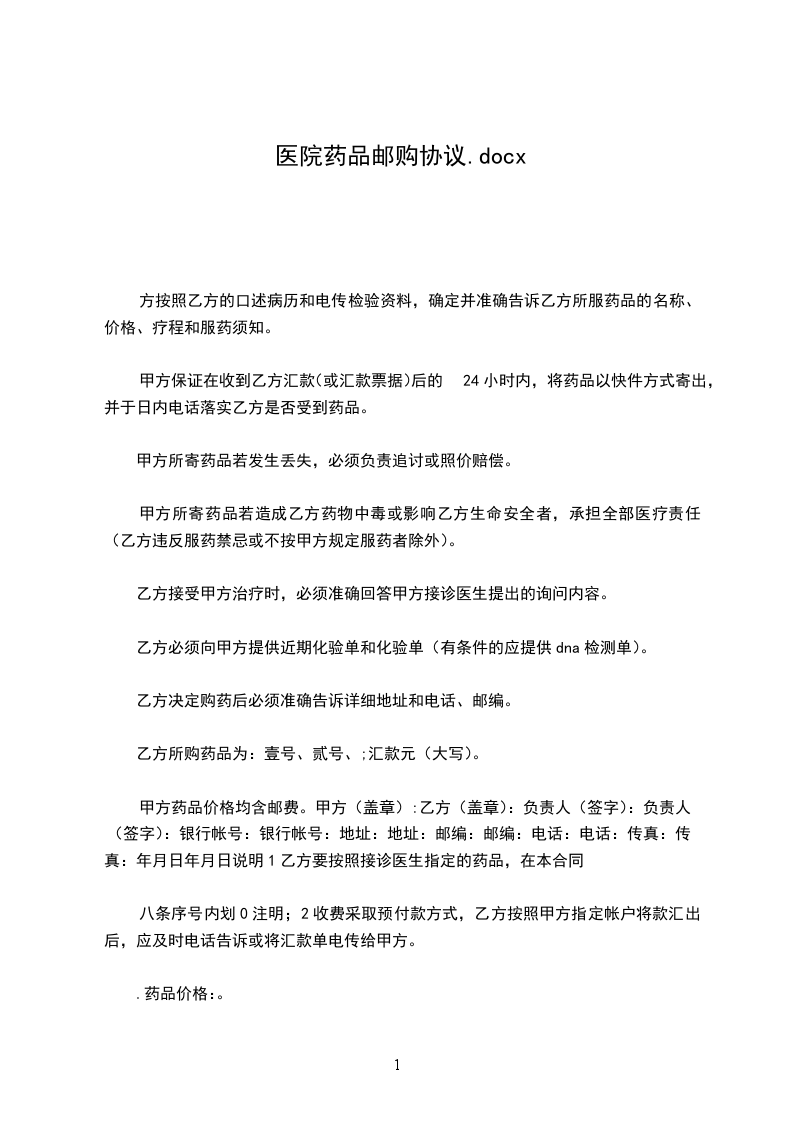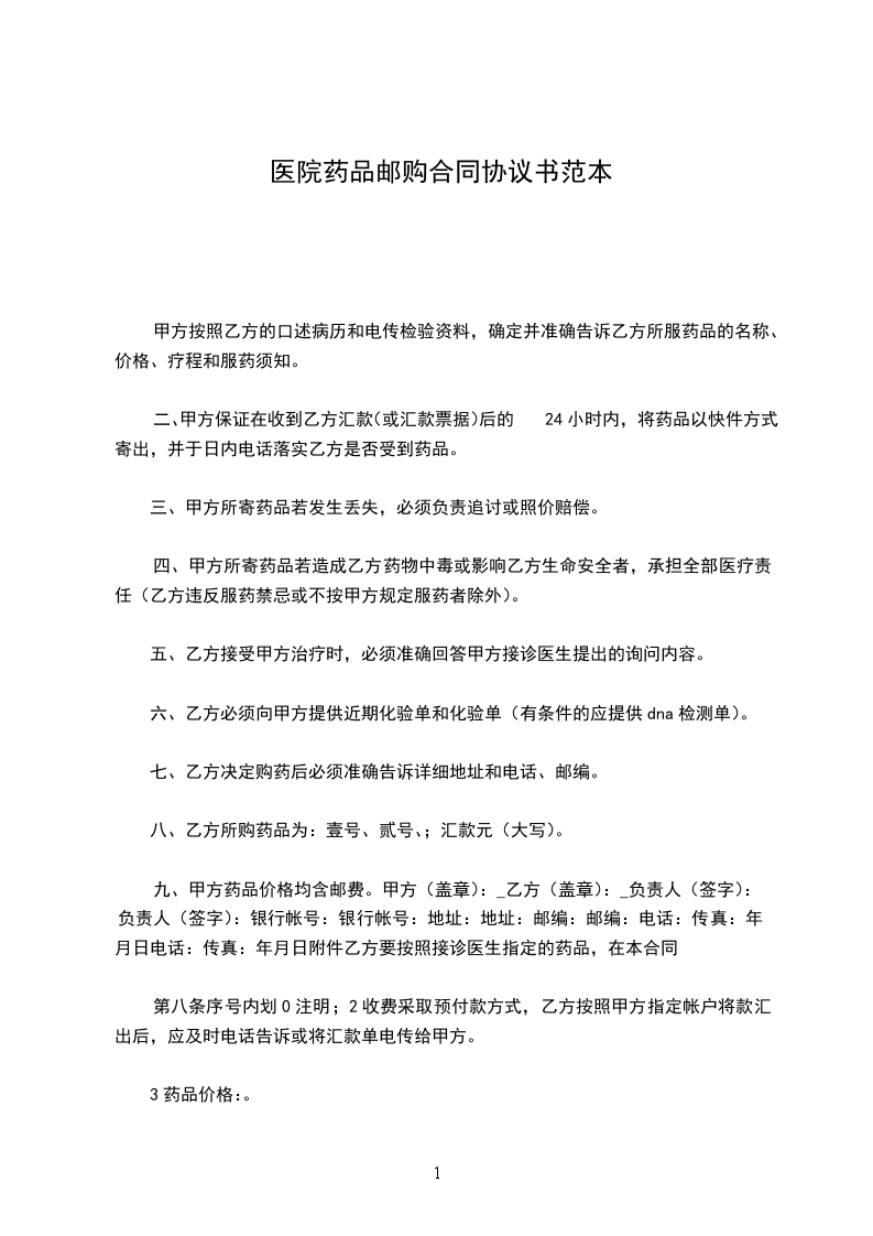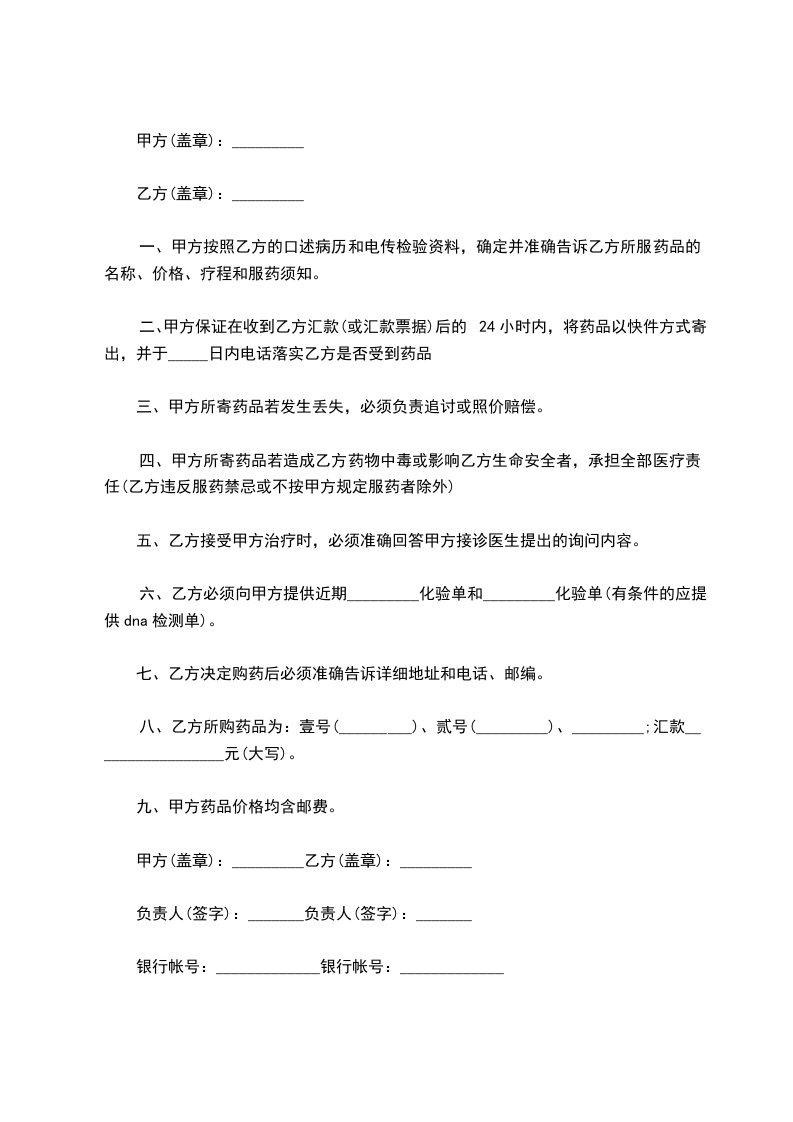 一、甲方按照乙方的口述病历和电传检验资料,确定并准确告诉乙方所服药品的名称、价格、疗程和服药须知。
