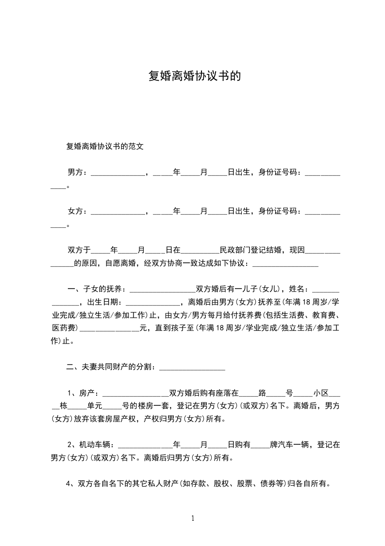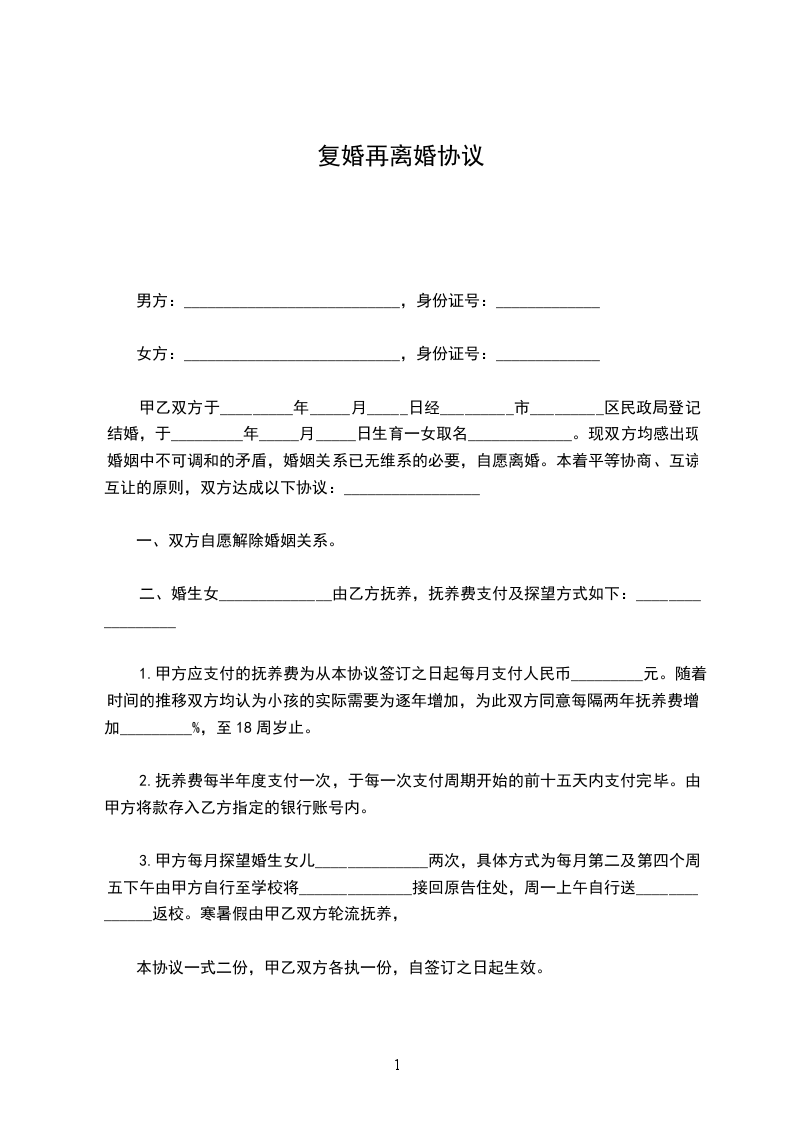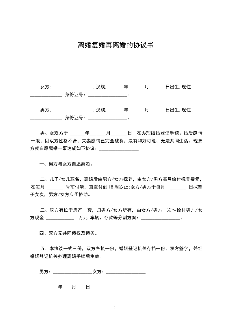 男方与女方于_____年___月认识,于_____年___月___日在___登记结婚,婚后于_____年___月___日生育一儿子/女儿,名______。因_____________致使夫妻感情确已破裂,已无和好可能,现经夫妻双方自愿协商达成一致意见,订立离婚协议如下: