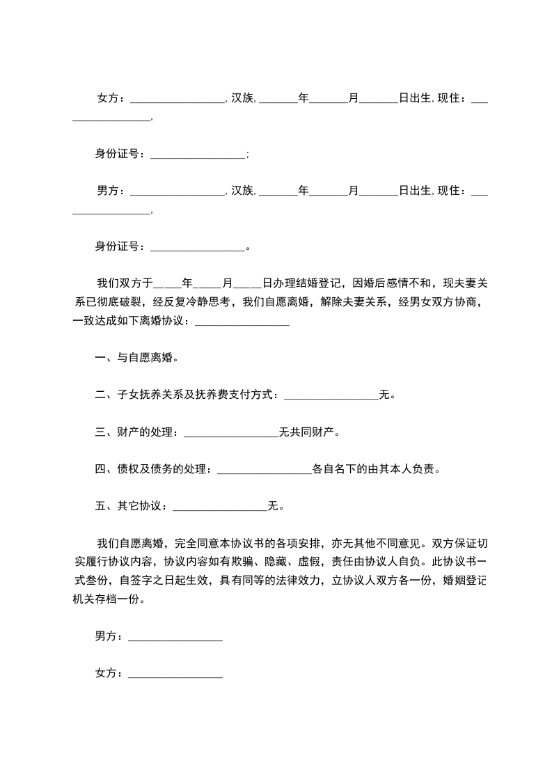 我们双方于_____年_____月_____日办理结婚登记,因婚后感情不和,现夫妻关系已彻底破裂,经反复冷静思考,我们自愿离婚,解除夫妻关系,经男女双方协商,一致达成如下离婚协议:_________________