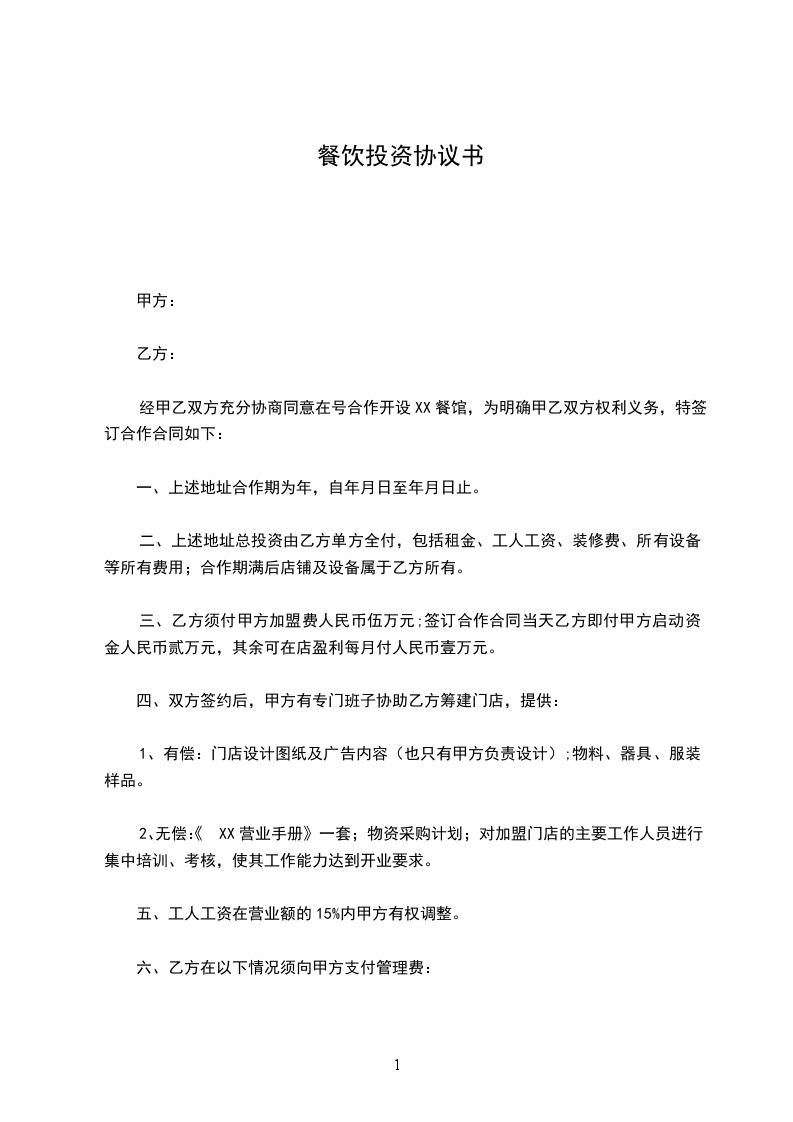 二、上述地址总投资由乙方单方全付,包括租金、工人工资、装修费、所有设备等所有费用;合作期满后店铺及设备属于乙方所有。