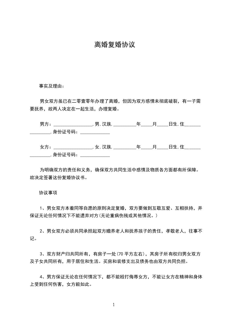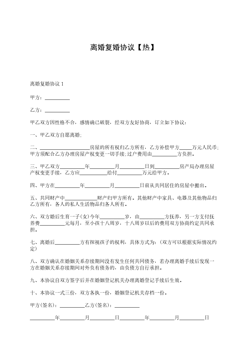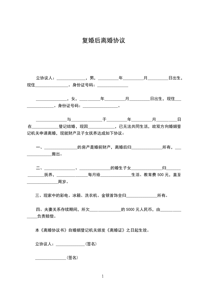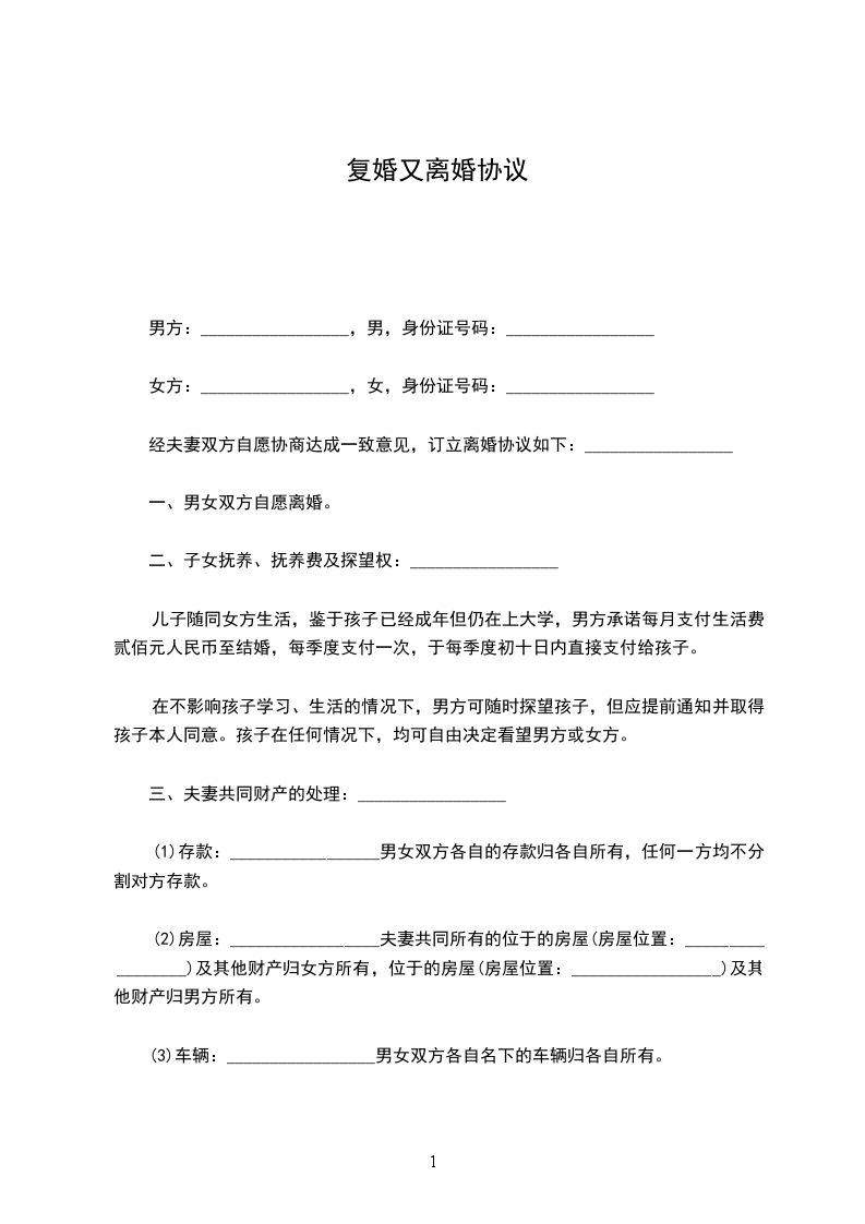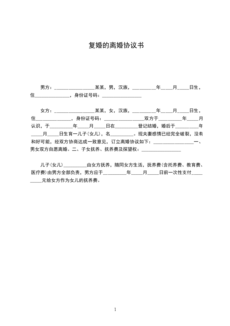 女方:_________________某某,女,汉族,__________年_____月_____日生,住_______________,身份证号码:_________________双方于__________年_____月认识,于__________年_____月_____日在__________登记结婚,婚后于__________年_____月_____日生育一儿子(女儿),名__________。现夫妻感情已经完全破裂,没有和好可能,经双方协商达成一致意见,订立离婚协议如下:_________________一、男女双方自愿离婚。二、子女抚养、抚养费及探望权:_________________