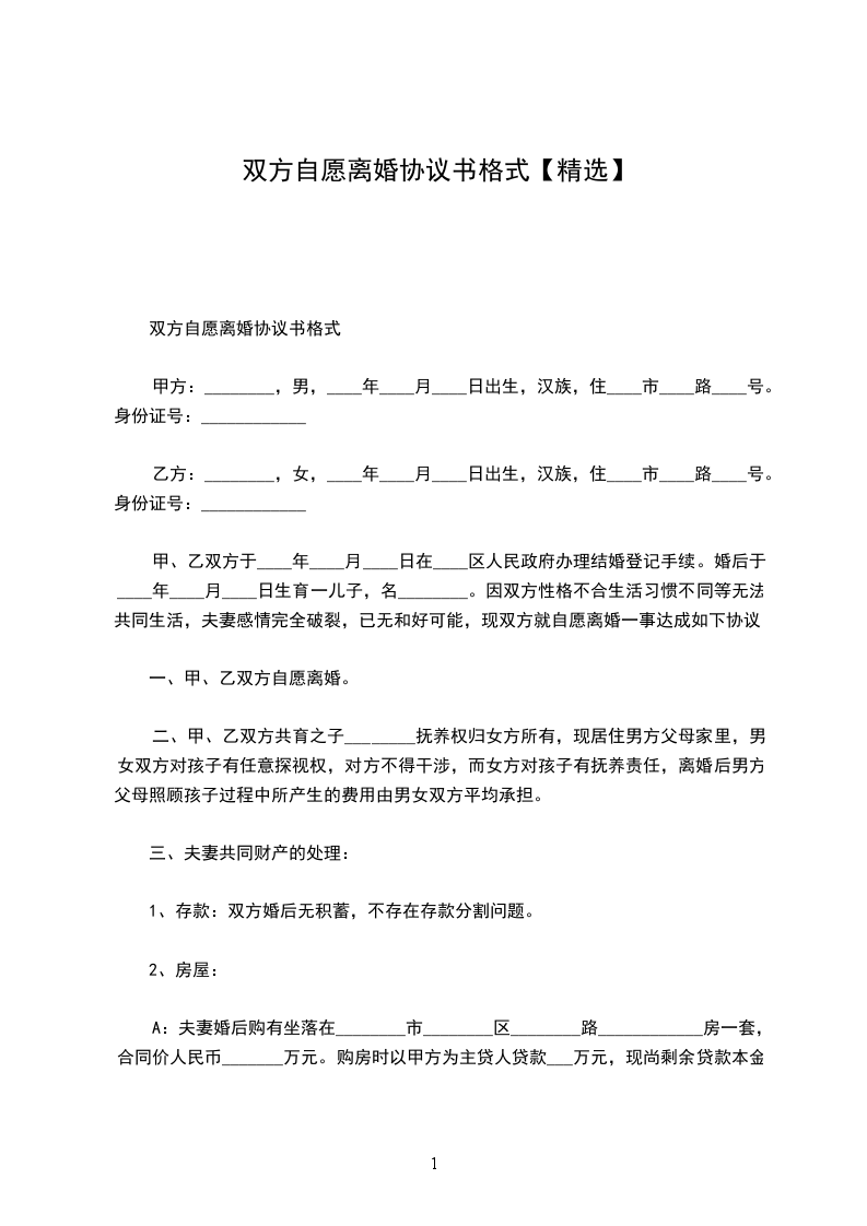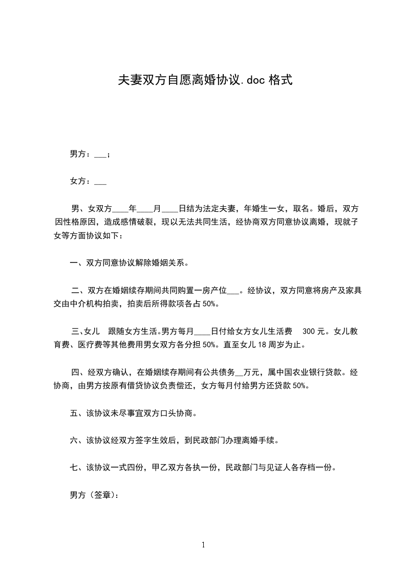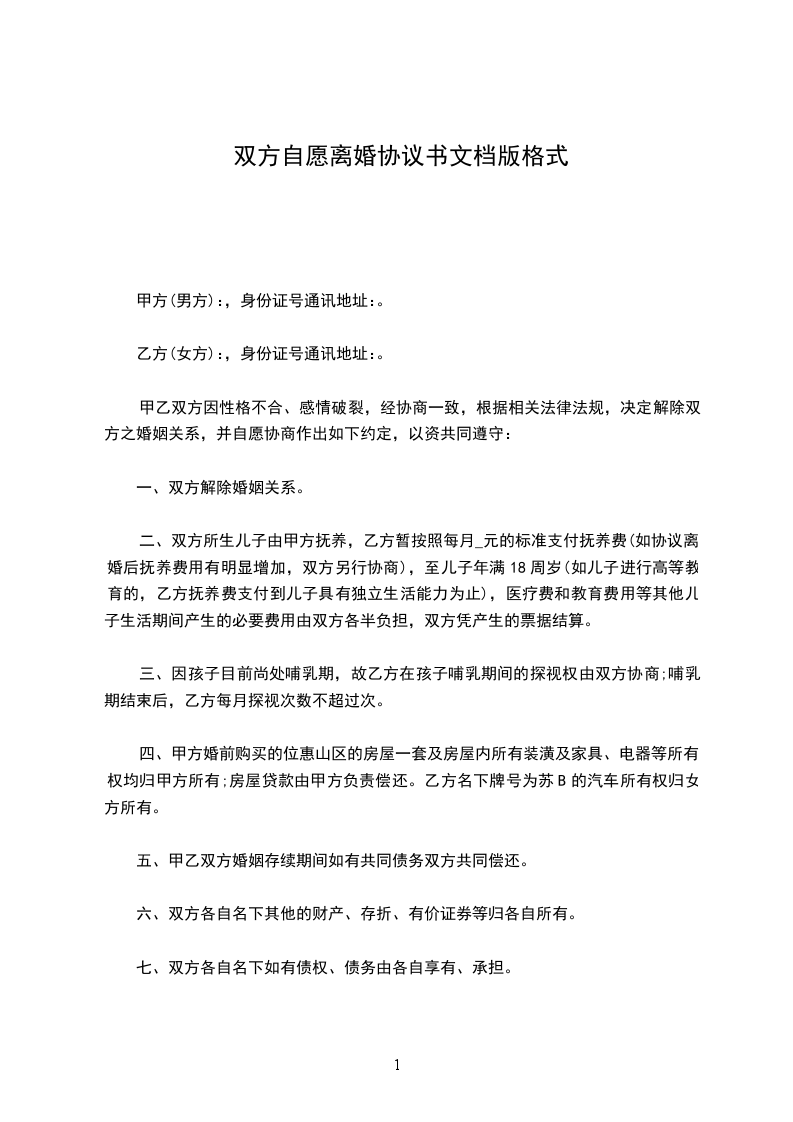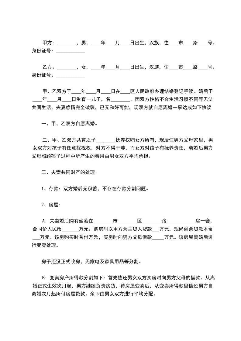 甲、乙双方于____年____月____日在____区人民政府办理结婚登记手续。婚后于____年____月____日生育一儿子,名________。因双方性格不合生活习惯不同等无法共同生活,夫妻感情完全破裂,已无和好可能,现双方就自愿离婚一事达成如下协议: