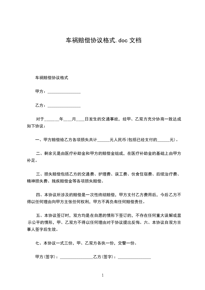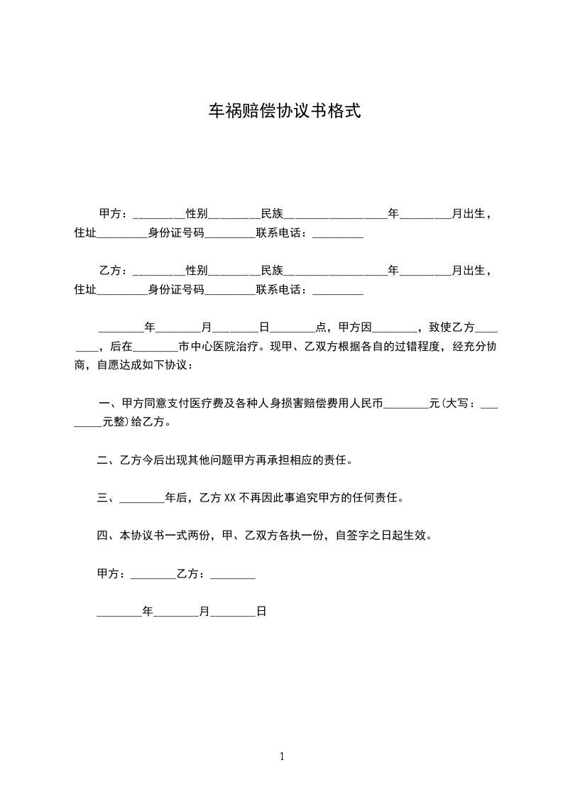 一、甲方同意支付医疗费及各种人身损害赔偿费用人民币________元(大写:________元整)给乙方。