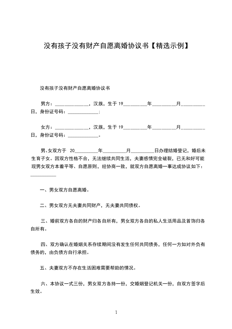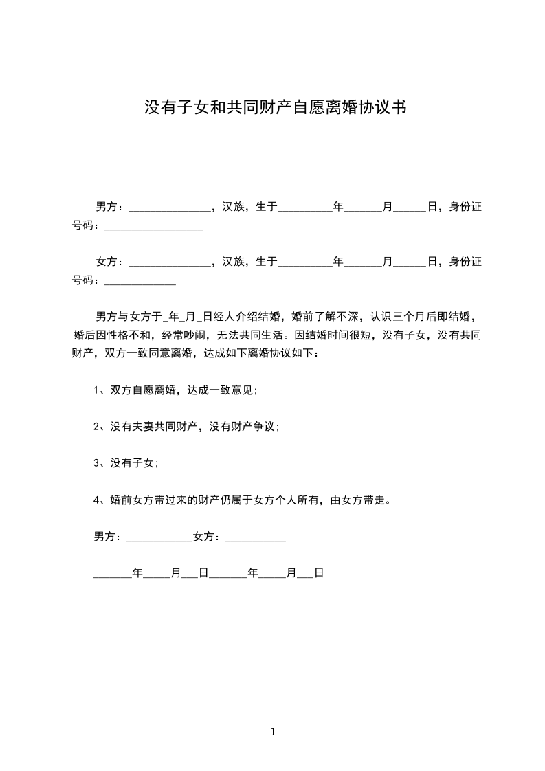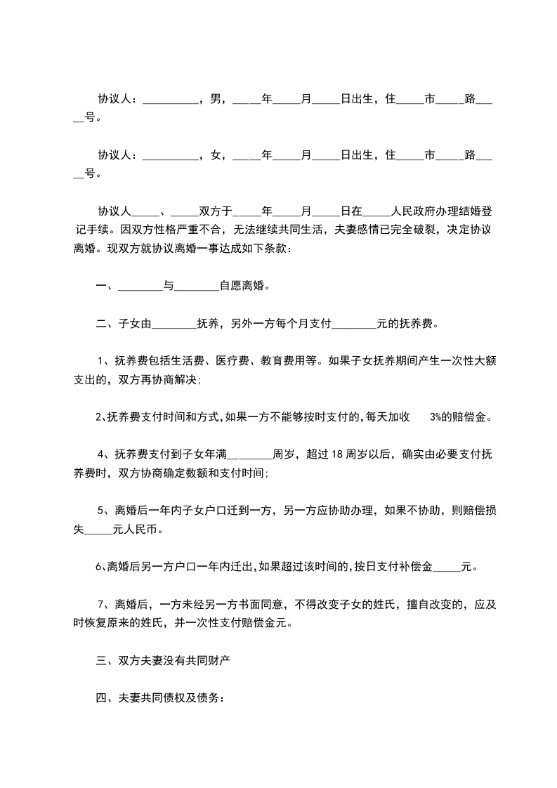 男、女双方于20__________年__________月__________日办理结婚登记,婚后未生育子女。因双方性格不合,无法继续共同生活,夫妻感情完全破裂,已无和好可能。现男女双方本着平等、自愿原则,经协商一致,就双方自愿离婚一事达成协议如下:_________________