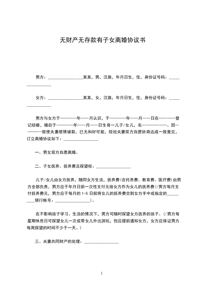 男方与女方于————年——月认识,于————年——月——日在————登记结婚,婚后于————年——月——日生育一儿子/女儿,名——————。因————-致使夫妻感情破裂,已无和好可能,现经夫妻双方自愿协商达成一致意见,订立离婚协议如下:_________________