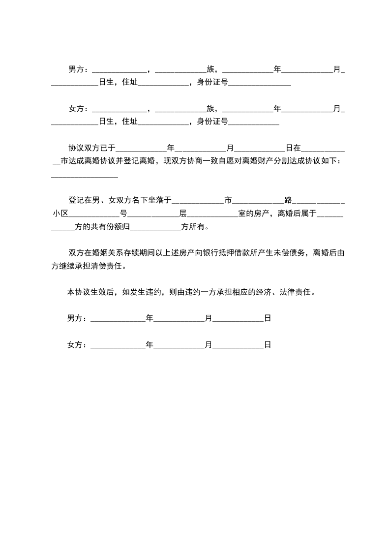 登记在男、女双方名下坐落于_____________市_____________路_____________小区_____________号_____________层_____________室的房产,离婚后属于_____________方的共有份额归_____________方所有。