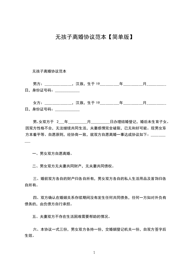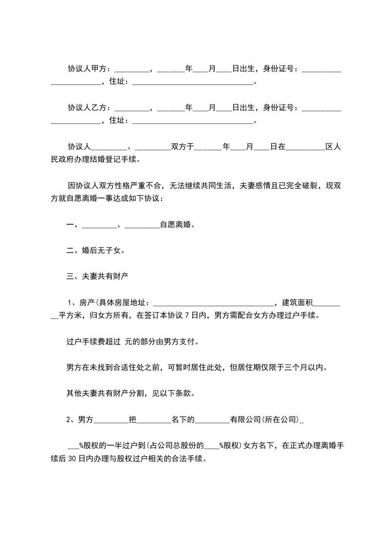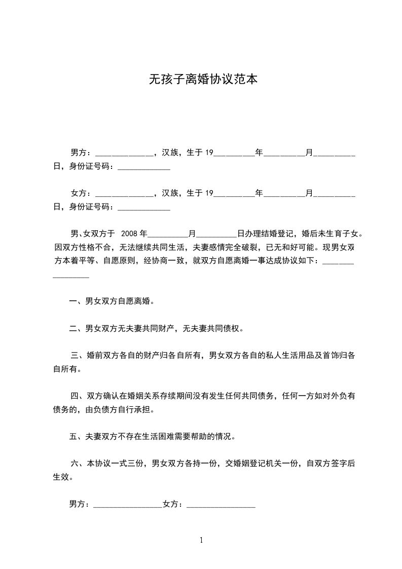 男、女双方于2008年__________月__________日办理结婚登记,婚后未生育子女。因双方性格不合,无法继续共同生活,夫妻感情完全破裂,已无和好可能。现男女双方本着平等、自愿原则,经协商一致,就双方自愿离婚一事达成协议如下:_________________
