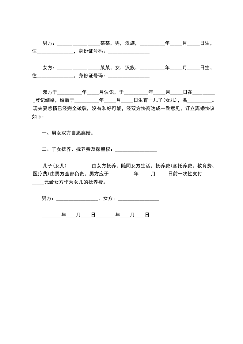 一、双方婚生女___________由男方抚养,女方每月___________日前支付共计__________元人民币抚养费。女方每月逢双周周六上午九点到男方处接孩子探视,于当日下午七点之前送回男方住处。