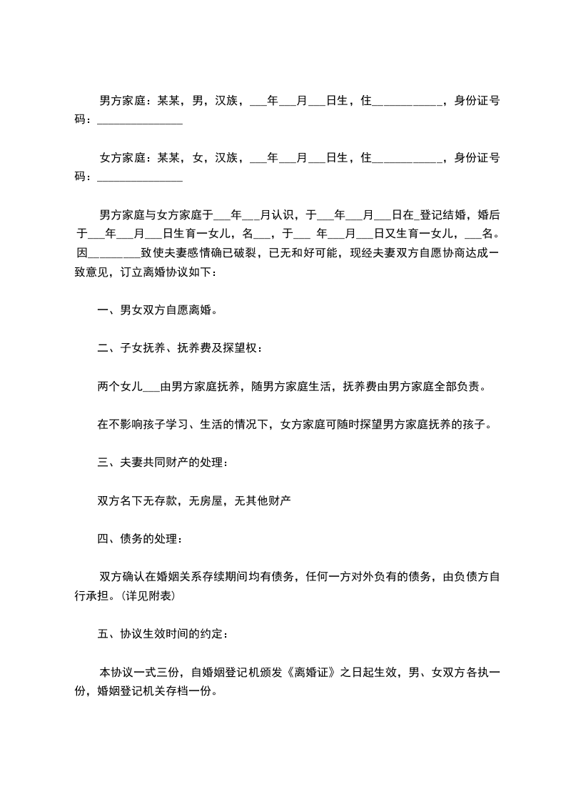男方与女方现因夫妻感情彻底破裂自愿离婚,经双方商定,对有关事项达成以下协议:_________________