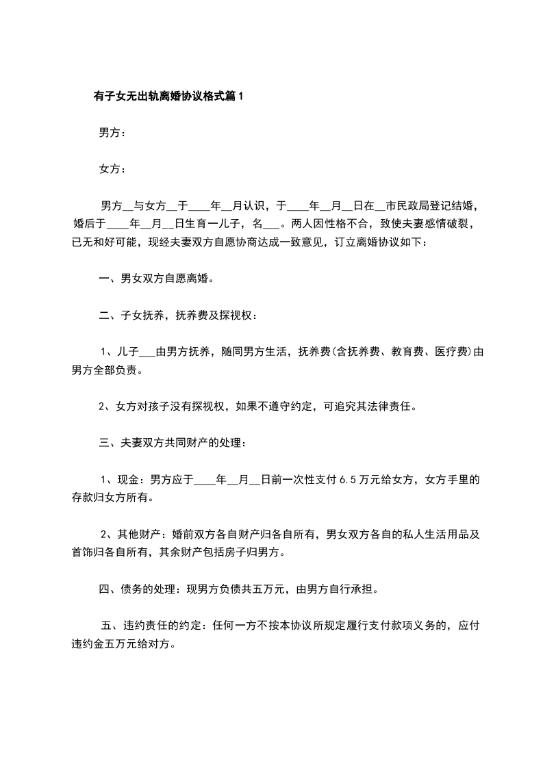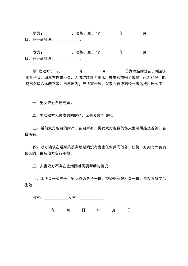 男、女双方于20__________年__________月__________日办理结婚登记,婚后未生育子女。因双方性格不合,无法继续共同生活,夫妻感情完全破裂,已无和好可能。现男女双方本着平等、自愿原则,经协商一致,就双方自愿离婚一事达成协议如下:_________________