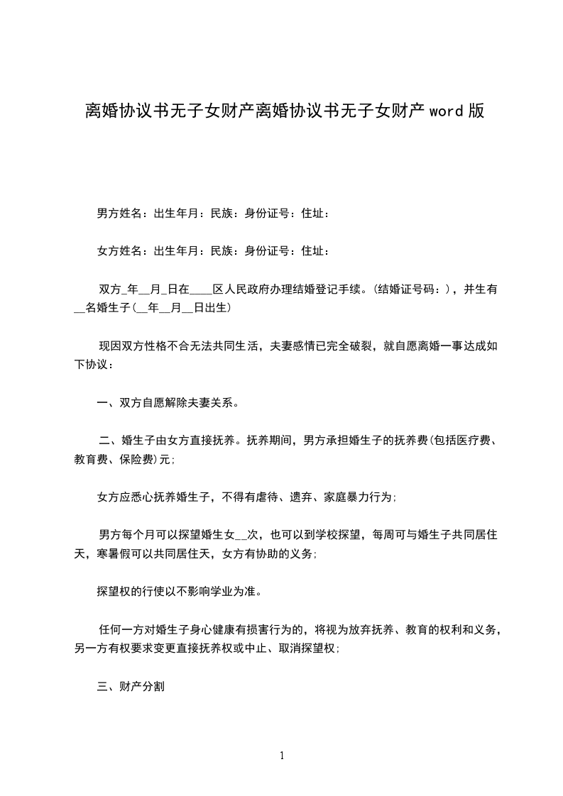 双方于__________年_____月_____日在__________登记结婚,婚后于__________年_____月_____日生育一子,姓名。现夫妻双方感情确已破裂,绝无可能挽回,经双方协商一致,订立离婚协议如下:_________________