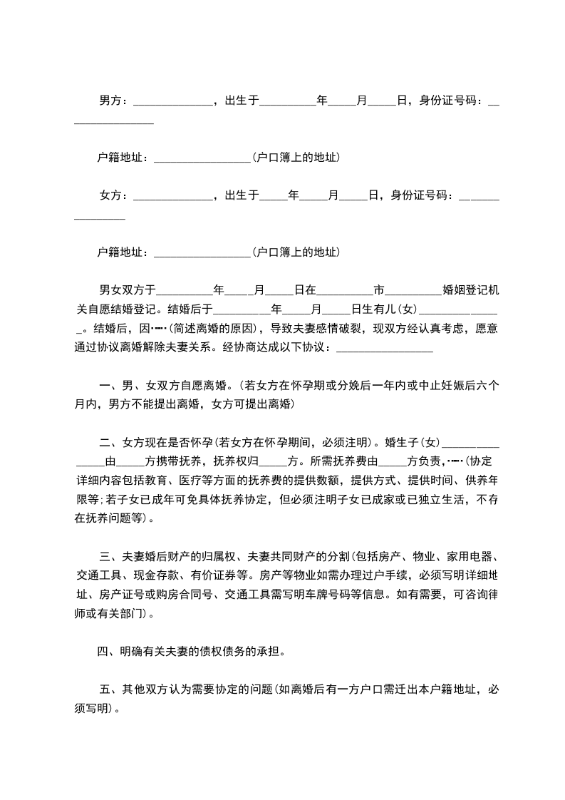 男女双方于__________年_____月_____日在__________市__________婚姻登记机关自愿结婚登记。结婚后于__________年_____月_____日生有儿(女)_______________。结婚后,因……(简述离婚的原因),导致夫妻感情破裂,现双方经认真考虑,愿意通过协议离婚解除夫妻关系。经协商达成以下协议:_________________