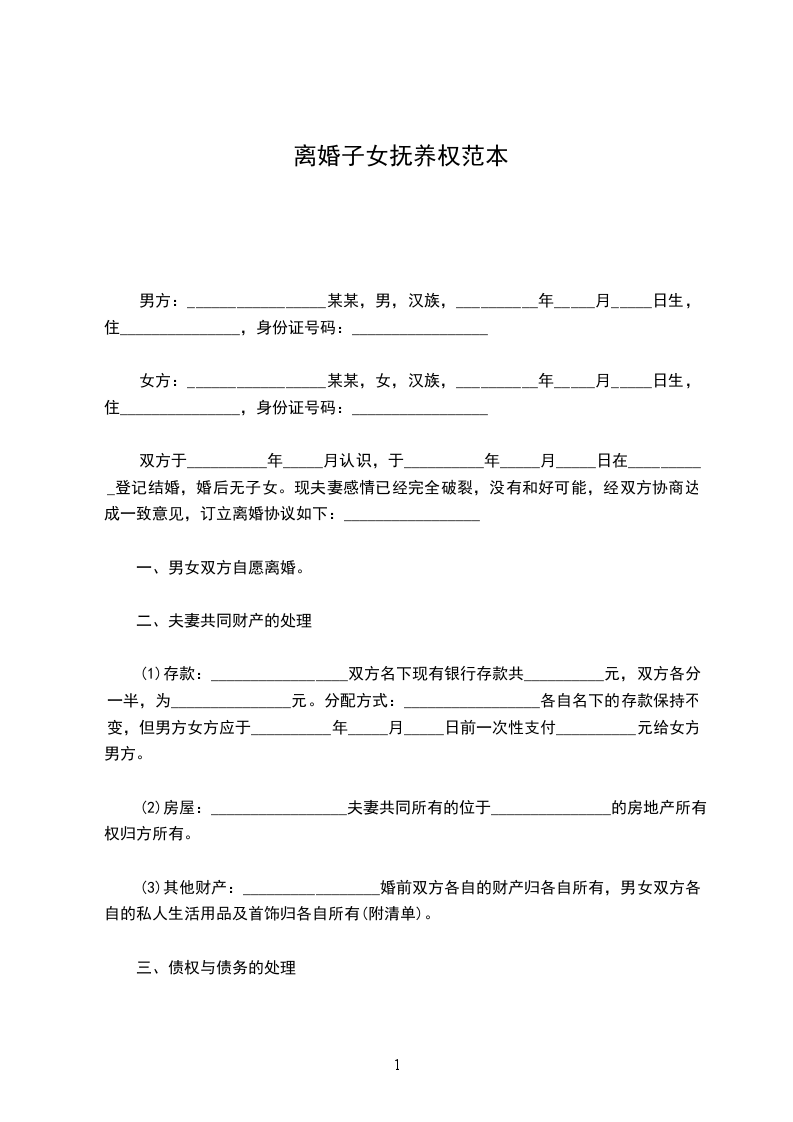 女方:_________________某某,女,汉族,__________年_____月_____日生,住_______________,身份证号码:_________________