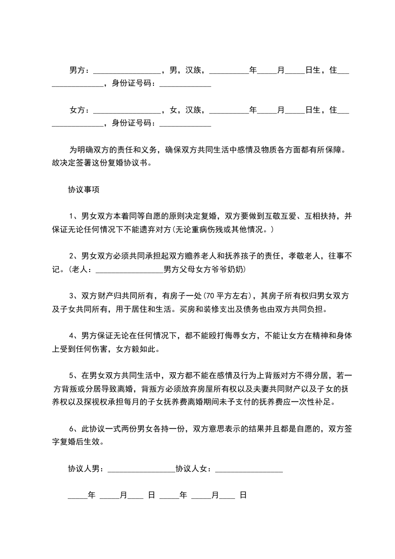 1、男女双方本着同等自愿的原则决定复婚,双方要做到互敬互爱、互相扶持,并保证无论任何情况下不能遗弃对方(无论重病伤残或其他情况。)