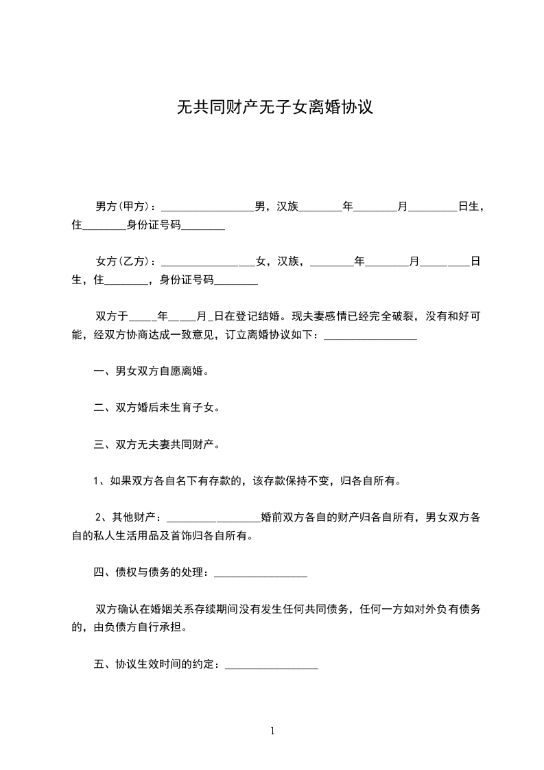 本无共同财产有一女离婚协议一式三份,男、女双方各执一份,婚姻登记机关存档一份,自婚姻登记机颁发《离婚证》之日起生效。