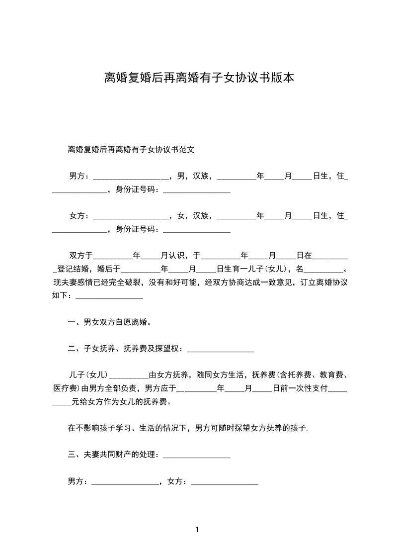 双方于__________年_____月认识,于__________年_____月_____日在__________登记结婚,婚后于__________年_____月_____日生育一儿子(女儿),名__________。现夫妻感情已经完全破裂,没有和好可能,经双方协商达成一致意见,订立离婚协议如下:_________________